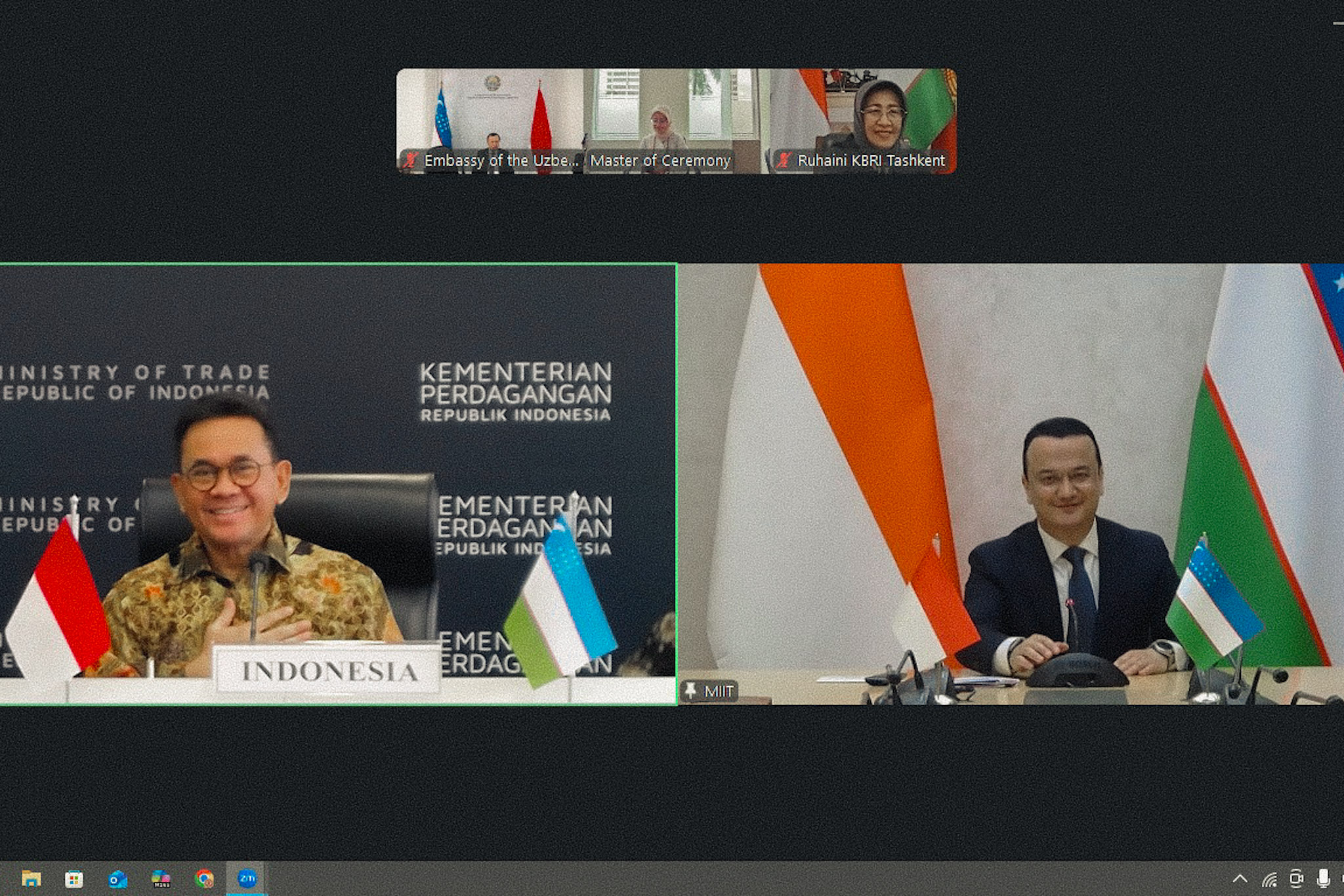 Menteri Perdagangan RI, Budi Santoso bersama Menteri Investasi, Industri, dan Perdagangan Uzbekistan, Laziz Kudratov secara resmi meluncurkan Perundingan Indonesia-Uzbekistan Free Trade Agreement (FTA) yang berlangsung secara daring di Jakarta, Senin (2 Mar).