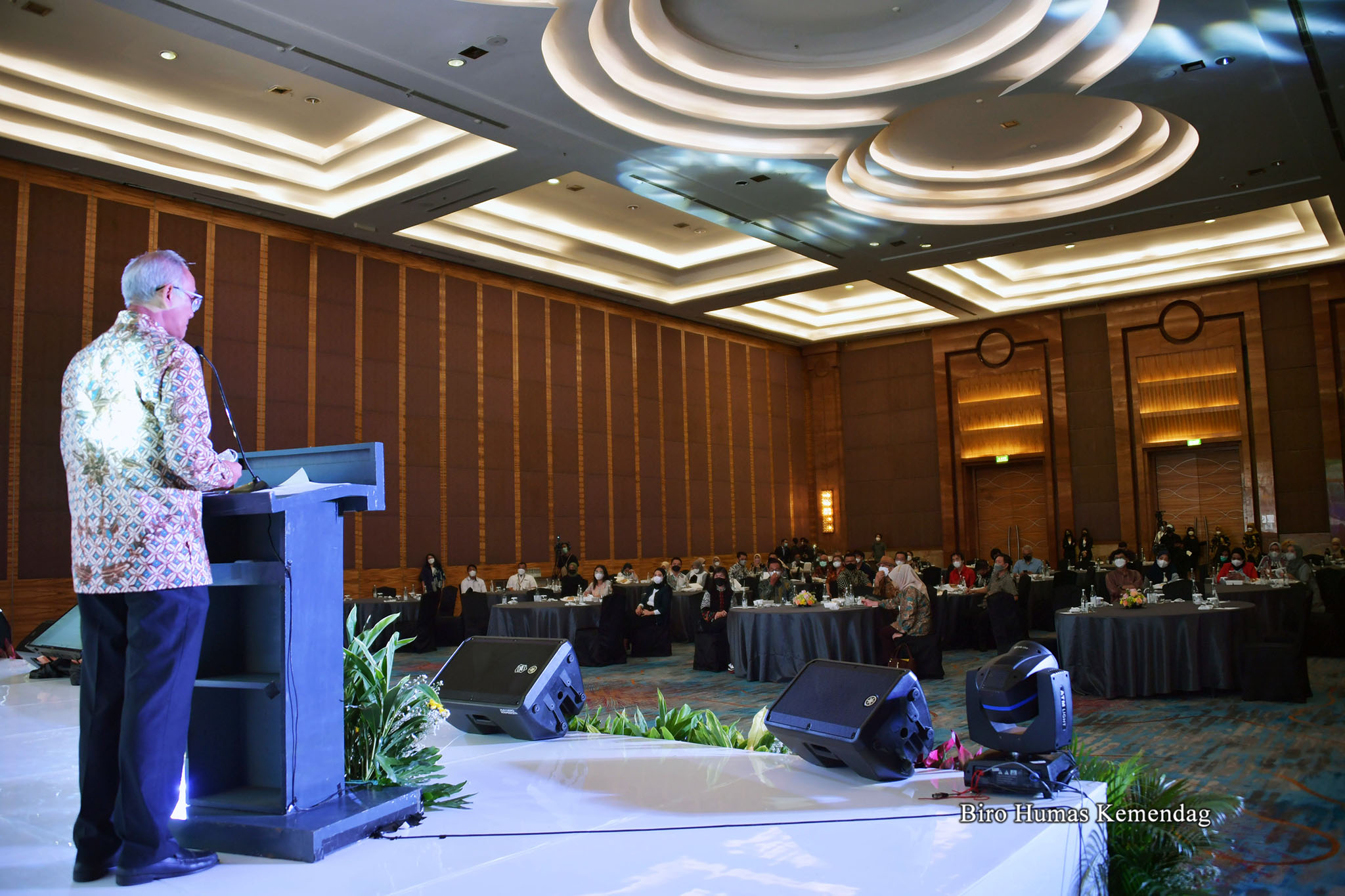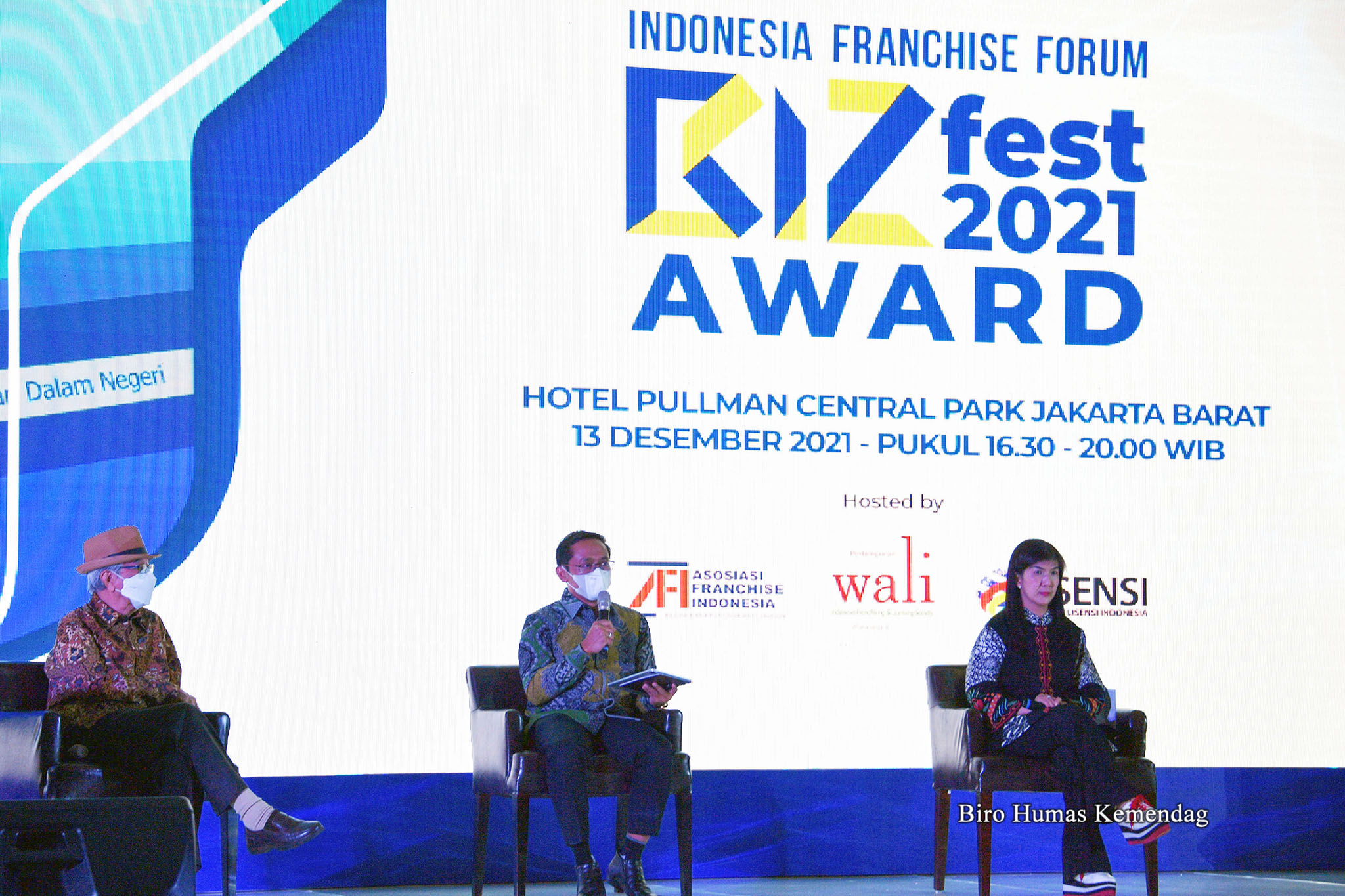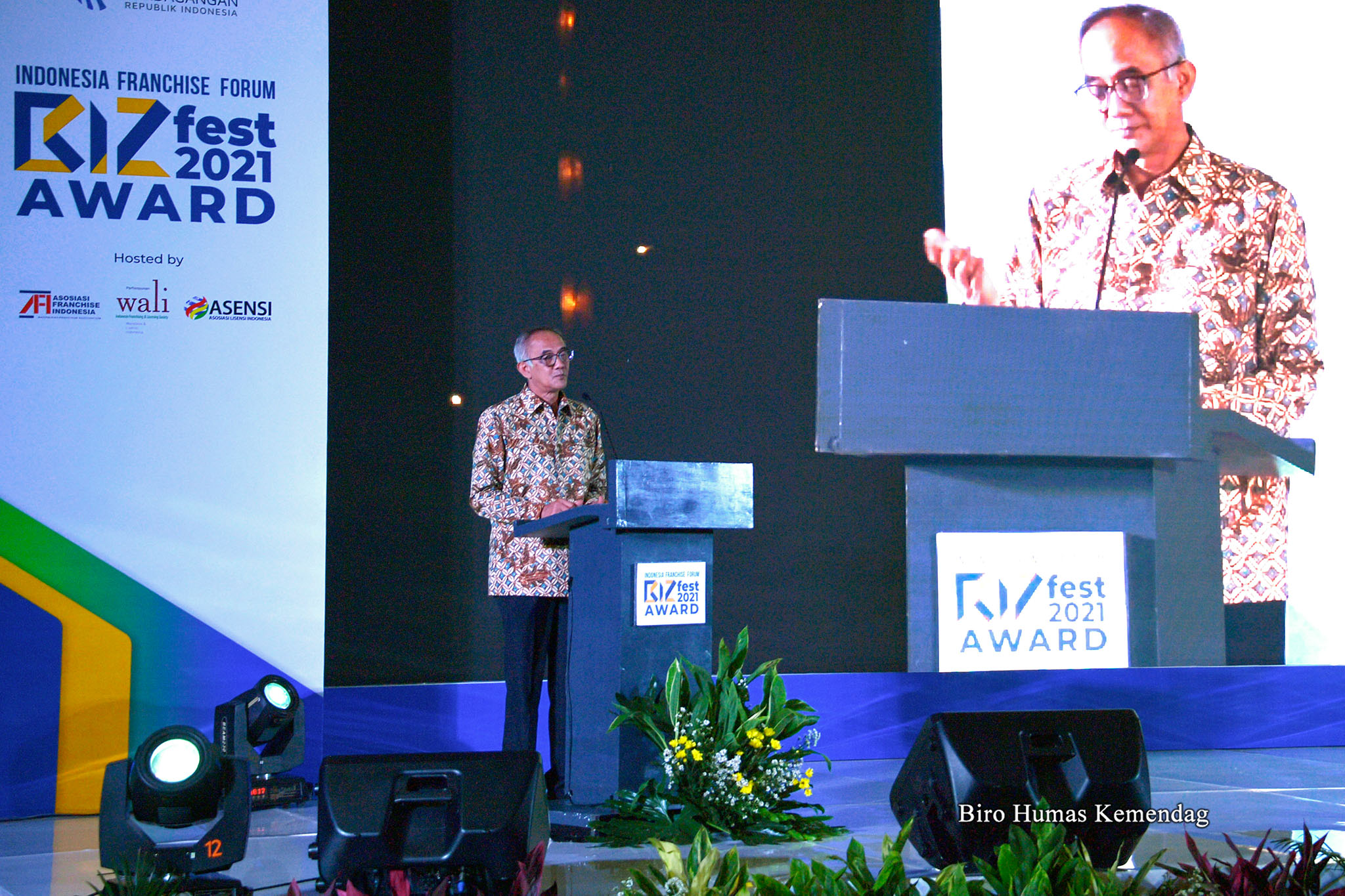 Direktur Jenderal Perdagangan Dalam Negeri, Oke Nurwan memberikan sambutan pada acara Pemberian Penghargaan Bizfest 2021 Award dan Penutupan Indonesia Franchise Forum yang berlangsung di Hotel Pullman Central Park, Jakarta, Senin (13 Des).
