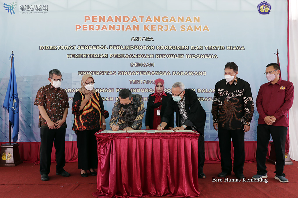Direktur Jenderal Perlindungan Konsumen dan Tertib Niaga (PKTN), Veri Anggrijono bersama Wakil Rektor Universitas Singaperbangsa Karawang, Amirudin menandatangani Naskah Kerja Sama Ditjen PKTN dengan Universitas Singaperbangsa Karawang tentang Penyebaran Informasi Perlindungan Konsumen Dalam Rangka Pembangunan Konsumen Cerdas dan Berdaya yang berlangsung di Universitas Singaperbangsa Karawang, Jawa Barat, Jumat (10 Des).