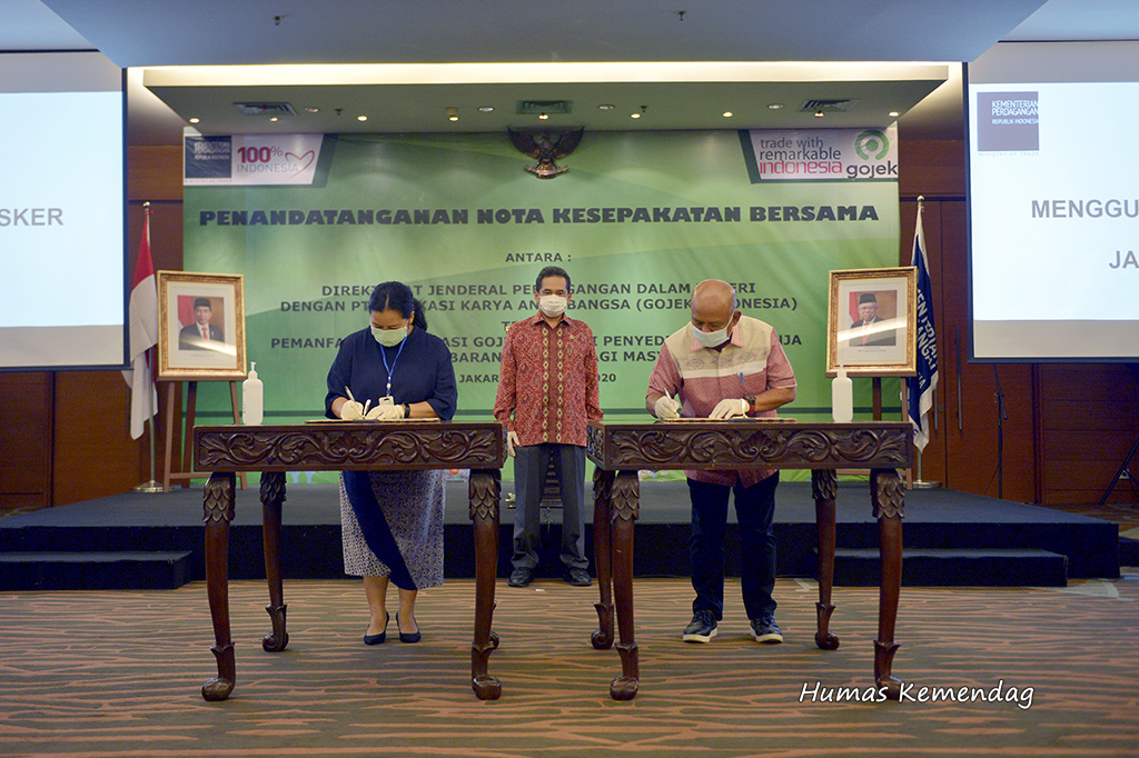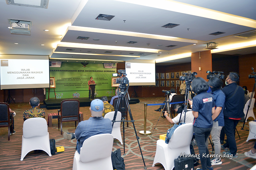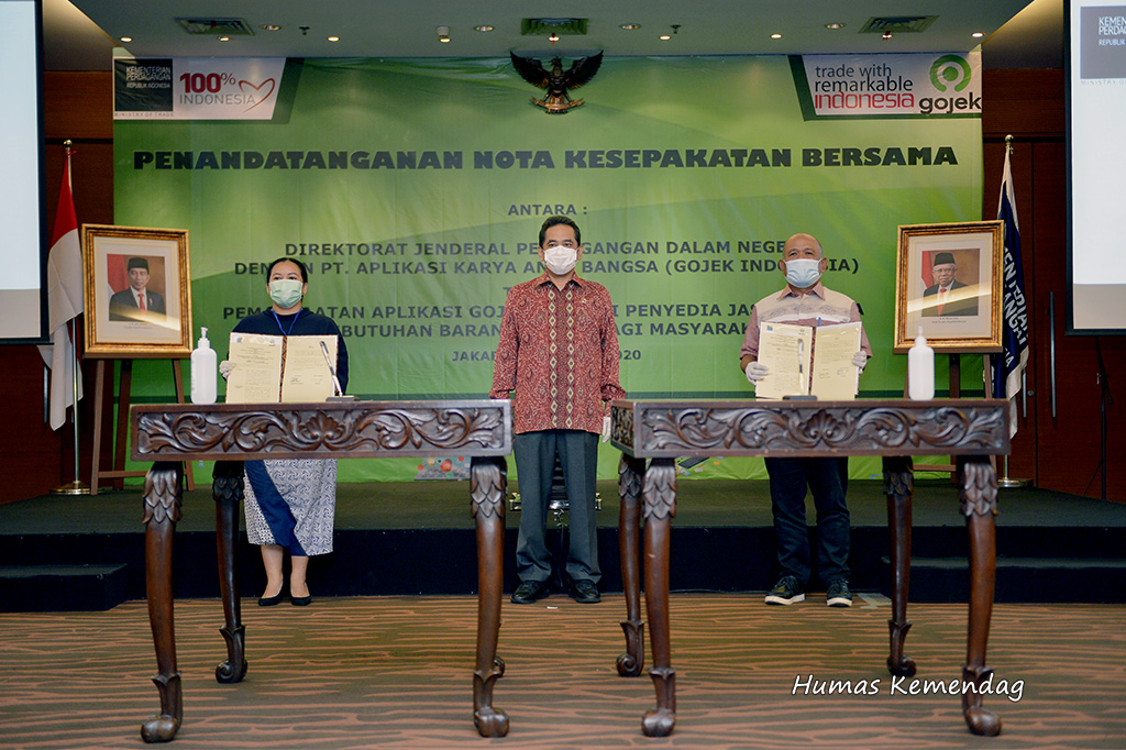 Menteri Perdagangan, Agus Suparmanto menyaksikan penandatanganan Nota Kesepahaman (MoU) antara Kementerian Perdagangan dan PT Aplikasi Karya Anak Bangsa (GO-JEK) terkait Distribusi Barang Kebutuhan Pokok di Kantor Kementerian Perdagangan, Jakarta, Senin (20 Apr). Penandatanganan dilakukan oleh Direktur Jenderal Perdagangan Dalam Negeri, Suhanto dan Kepala Kebijakan Publik dan Hubungan Pemerintah GO-JEK, Shinto Nugroho.