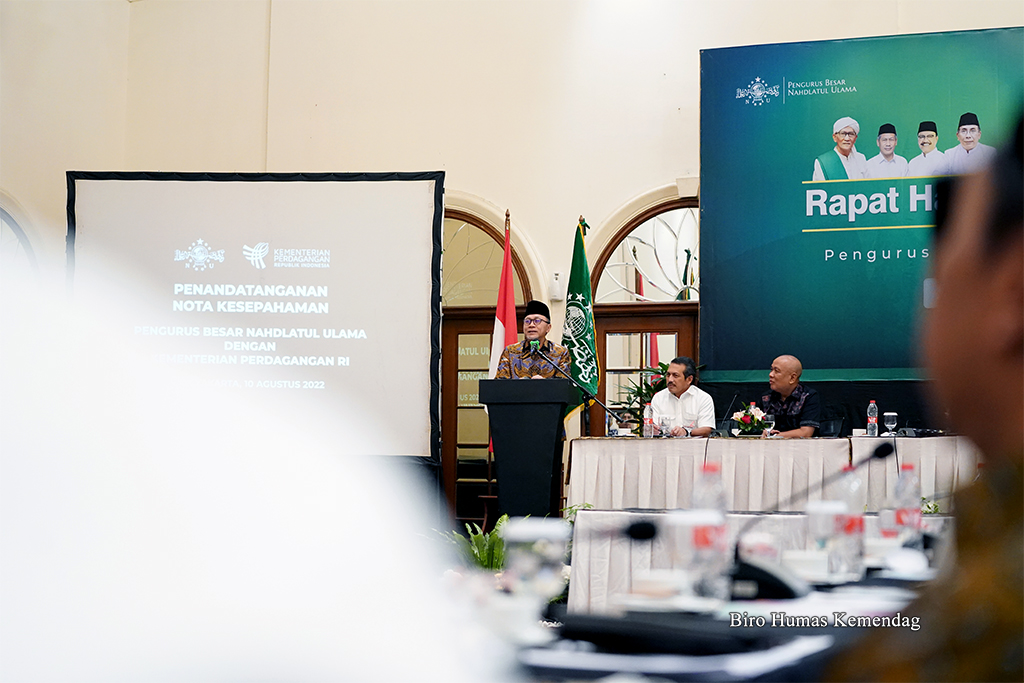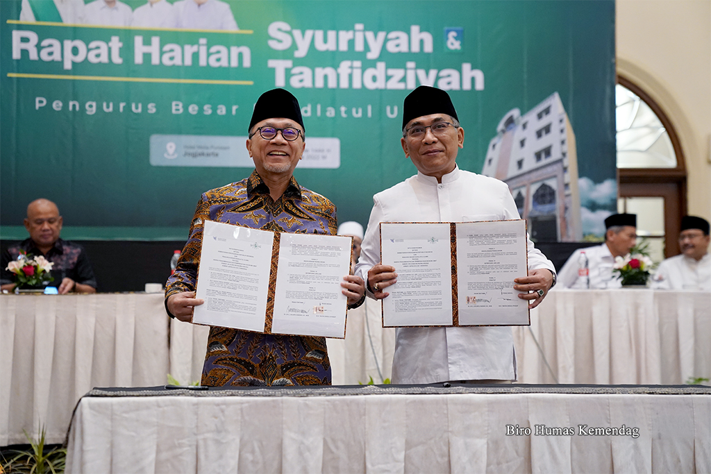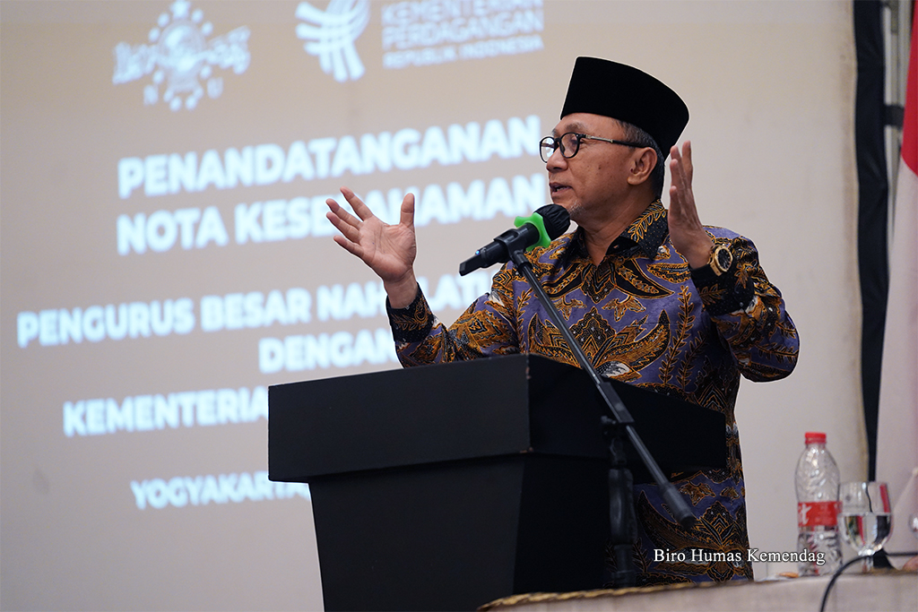 Menteri Perdagangan, Zulkifli Hasan melakukan penandatanganan Nota Kesepahaman (MoU) Sinergi Pengembangan dan Pemberdayaan Ekonomi Umat dengan Ketua Umum Pengurus Besar Nahdlatul Ulama (PBNU), Yahya Cholil Staquf di Yogyakarta, Rabu (10 Agt).