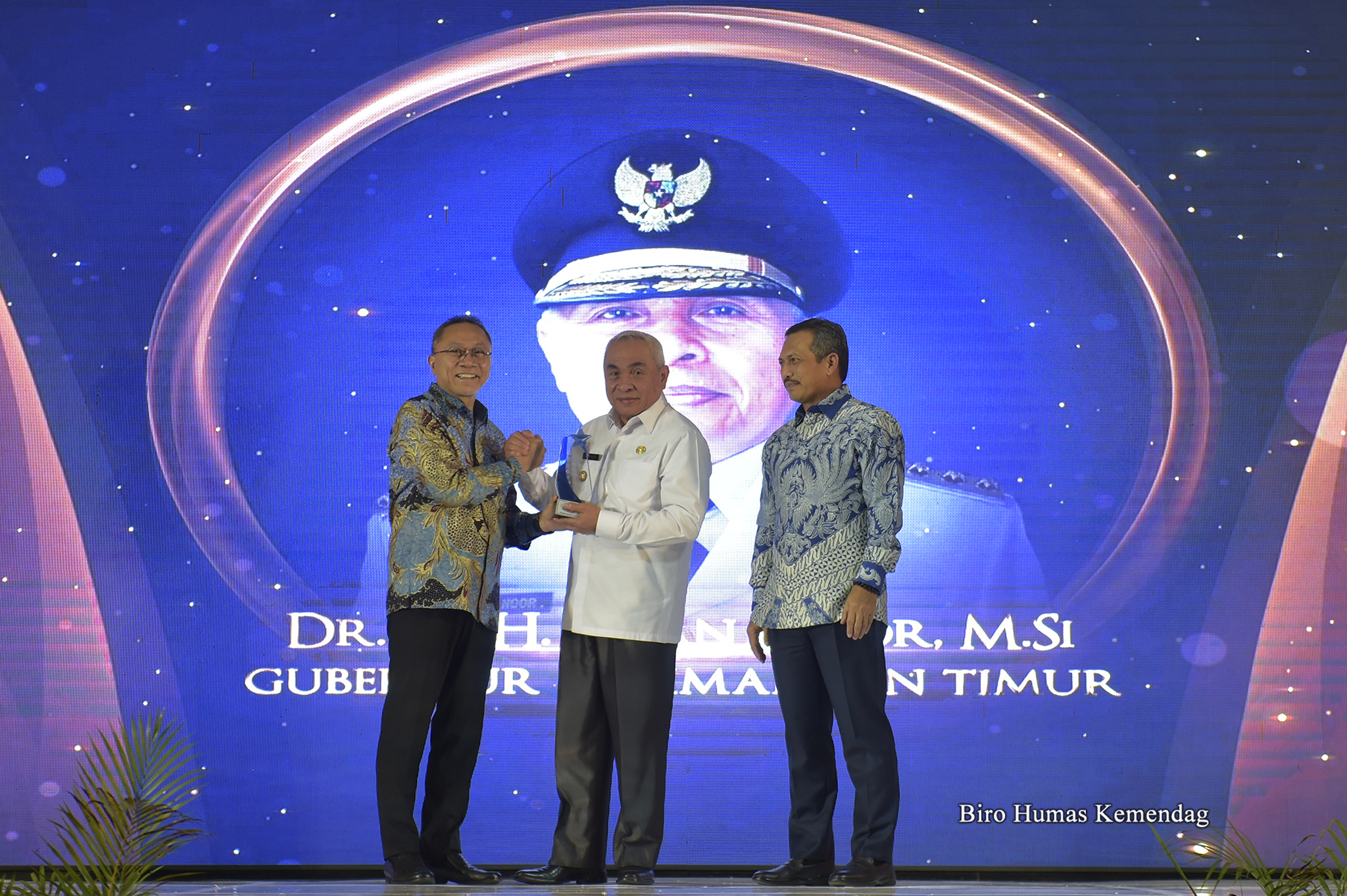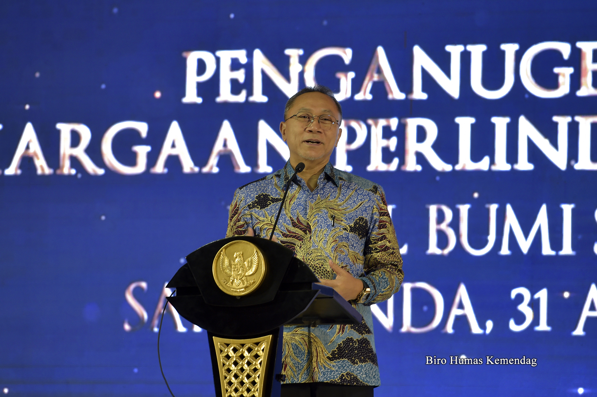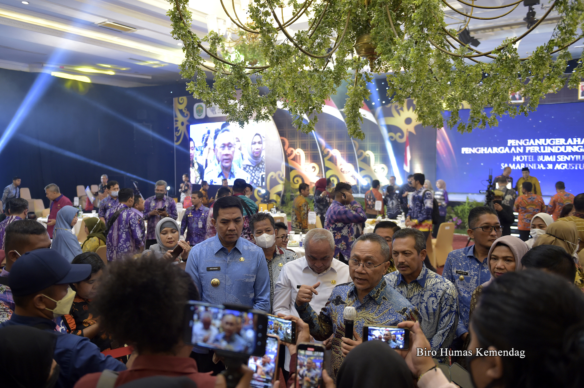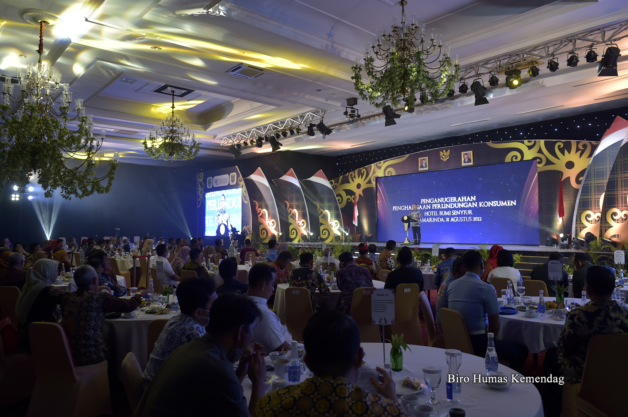 Menteri Perdagangan, Zulkifli Hasan didampingi Direktur Jenderal Perlindungan Konsumen dan Tertib Niaga, Veri Anggrijono menganugerahkan penghargaan perlindungan konsumen sebagai bentuk apresiasi kepada pemerintah daerah yang berlangsung di Hotel Bumi Senyiur, Samarinda, Kalimantan Timur, Rabu (31 Agt).