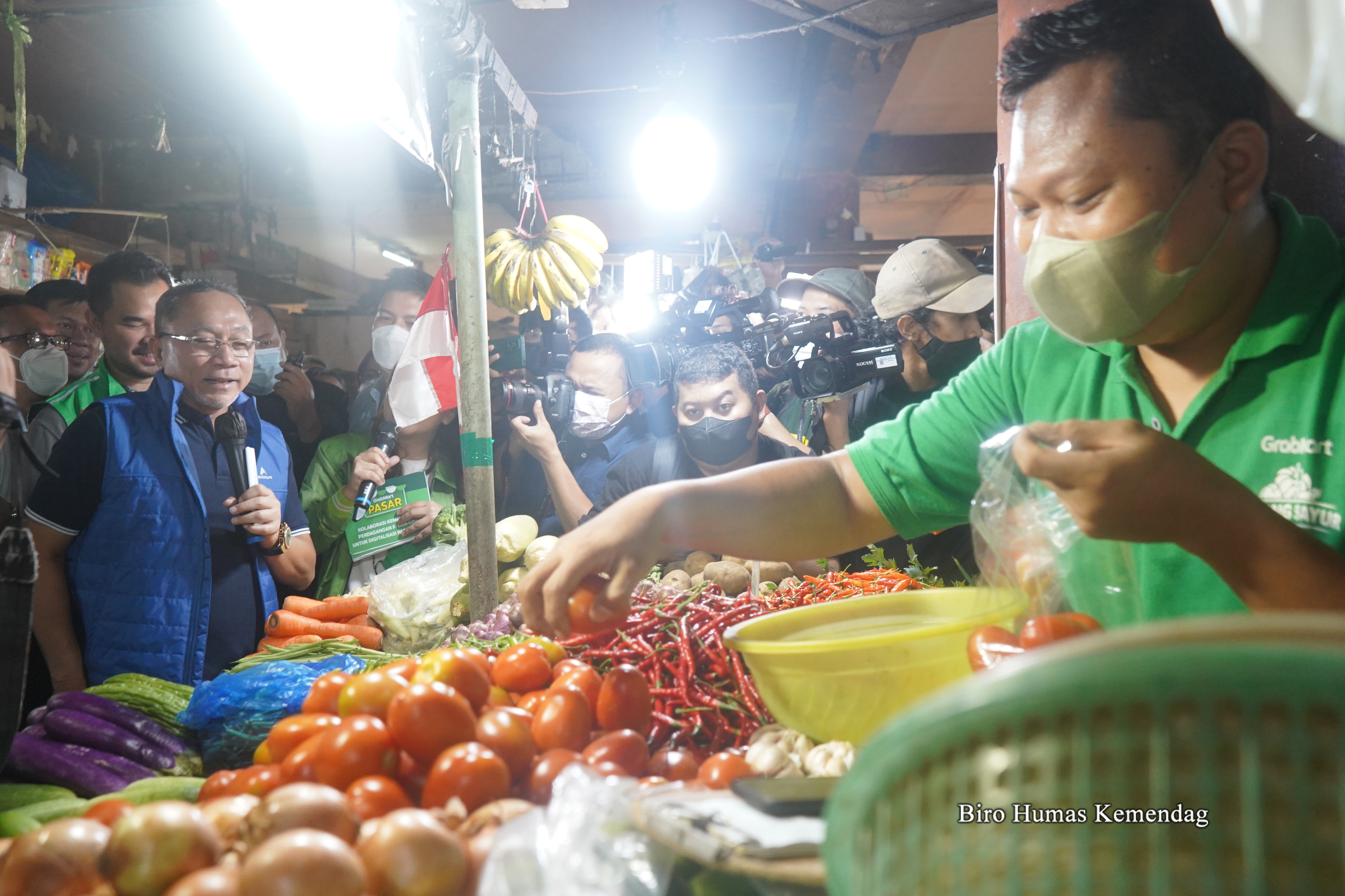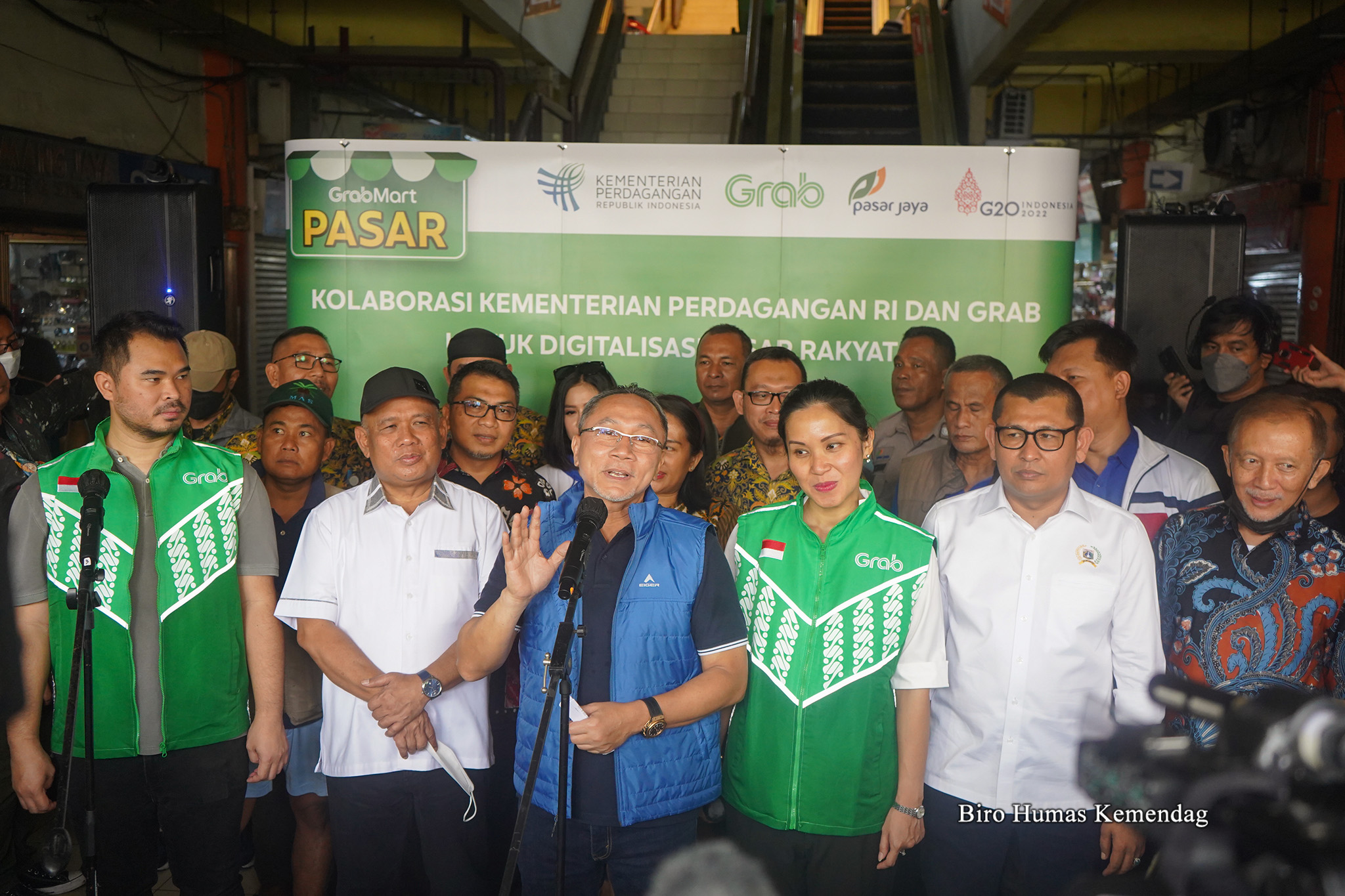 Menteri Perdagangan, Zulkifli Hasan meninjau implementasi penerapan program digitalisasi pasar rakyat melalui lokapasar "GrabMart" di Pasar Tomang Baru, Jakarta, Kamis (18 Agt).