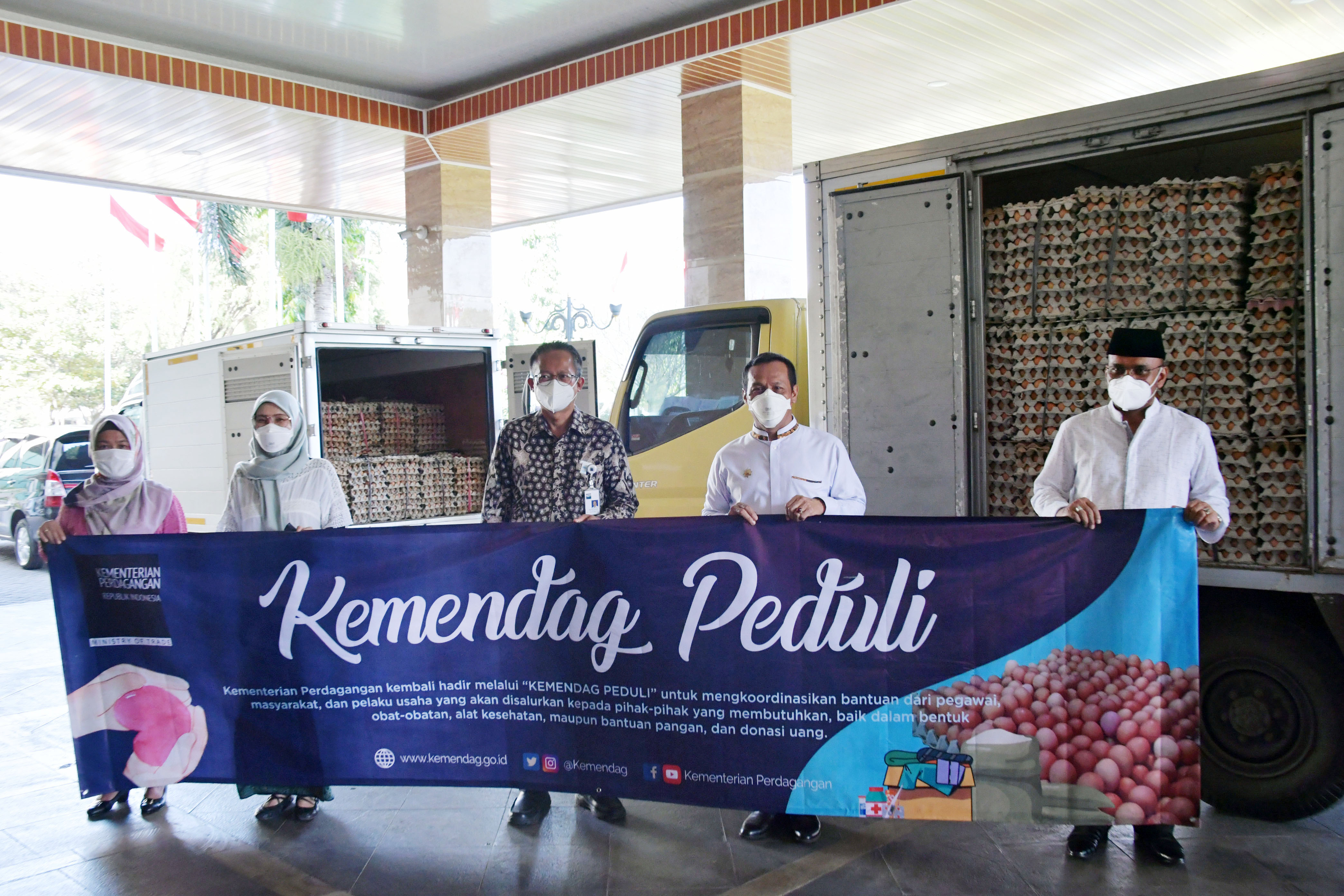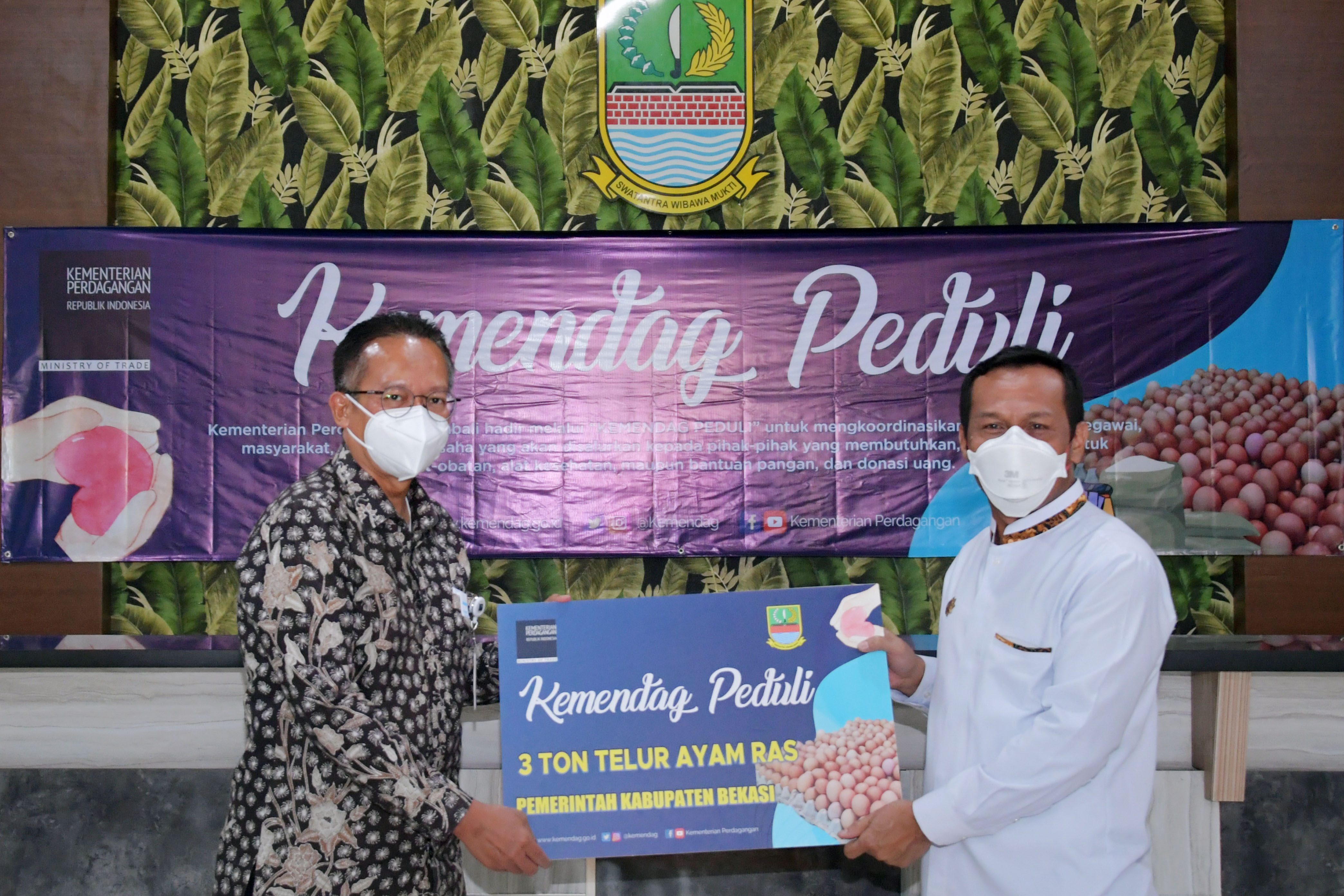 Inspektur Jenderal, Didid Noordiatmoko menyerahkan bantuan Kemendag Peduli kepada Pemerintah Kabupaten Bekasi yang berlangsung di Kantor Bupati Bekasi di Cikarang, Jawa Barat, Jumat (8 Agustus). Penyerahan bantuan berupa 3 ton telur ayam diterima langsung oleh Pj. Sekretaris Daerah Kabupaten Bekasi, Herman Hanafi.