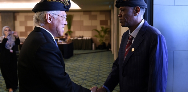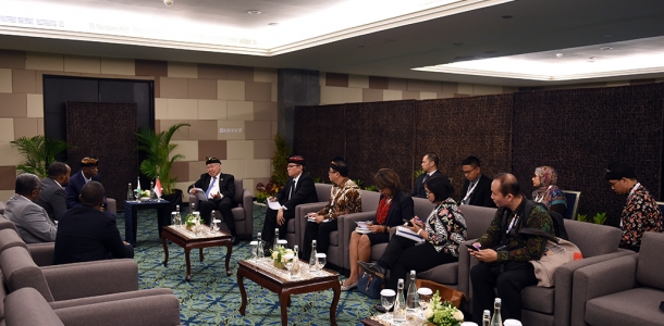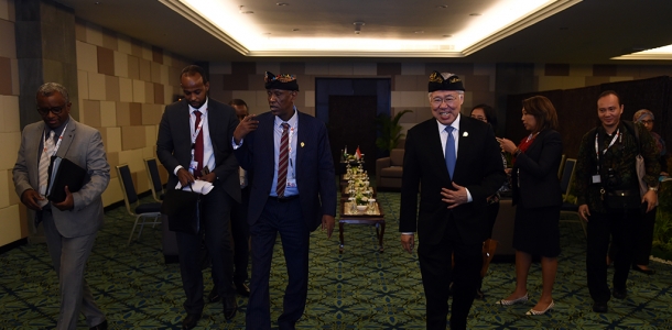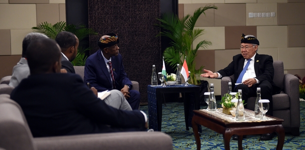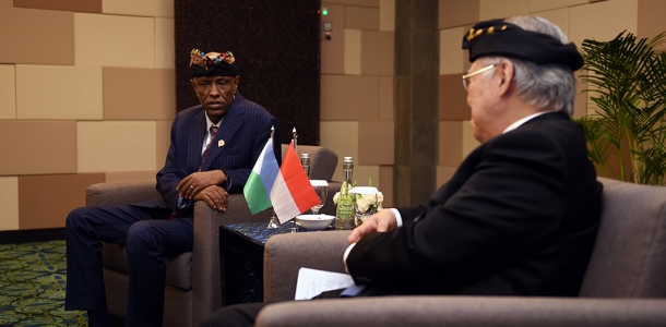 Menteri Perdagangan RI, Enggartiasto Lukita melakukan pertemuan bilateral dengan Menteri Perdagangan Djibouti, Hassan Houmed di sela-sela Indonesia-Africa Infrastructure Dialogue 2019 yang berlangsung di Bali Nusa Dua Convention Center (BNDCC), Bali, Selasa (20/8).