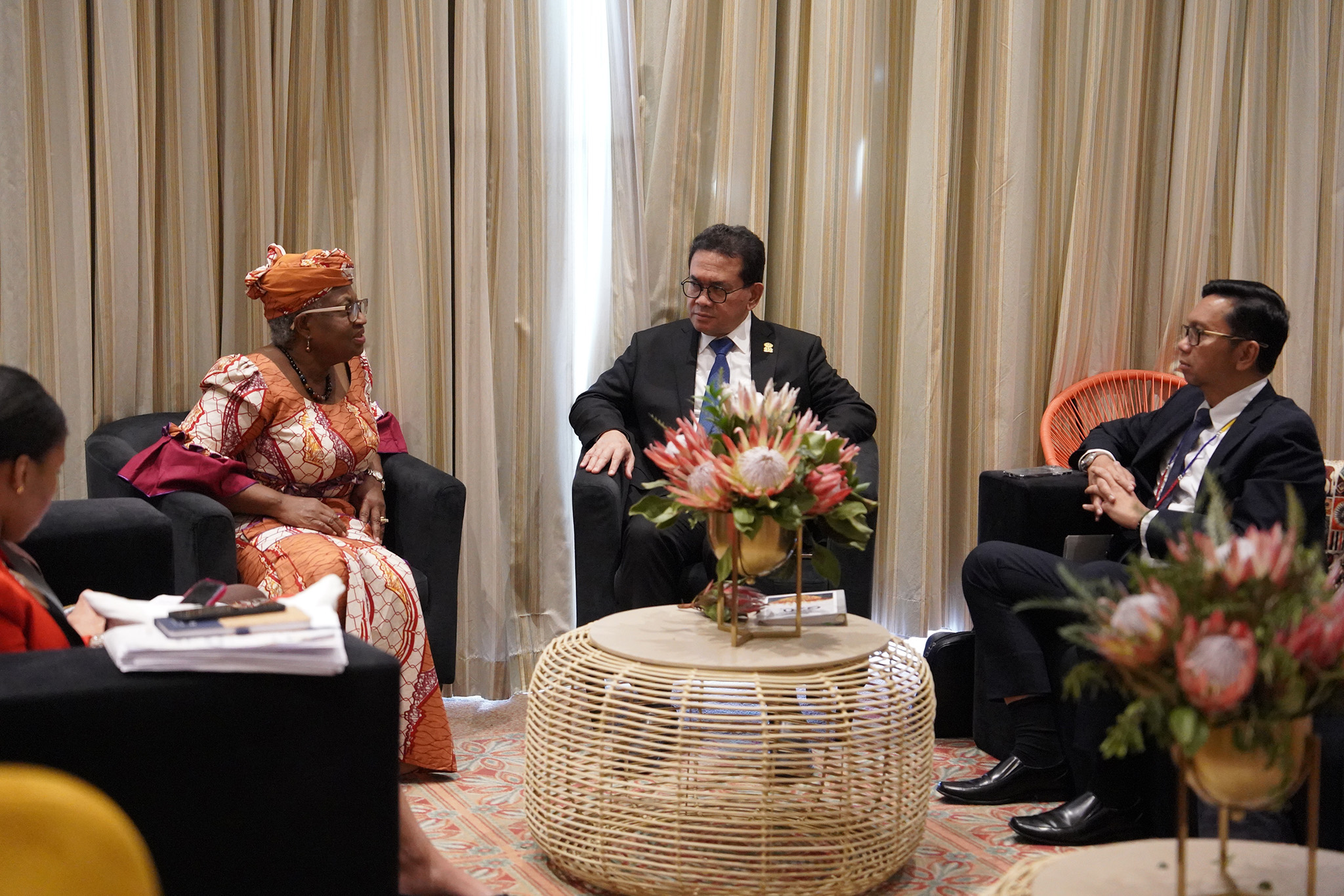 Menteri Perdagangan RI, Budi Santoso melakukan pertemuan dengan Direktur Jenderal Organisasi Perdagangan Dunia (WTO), Ngozi Okonjo-Iweala di sela kegiatan TIMM G20 di Gqeberha, Afrika Selatan, Jumat (10 Okt).