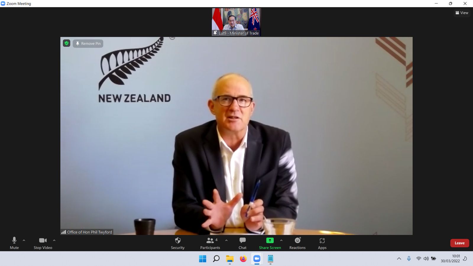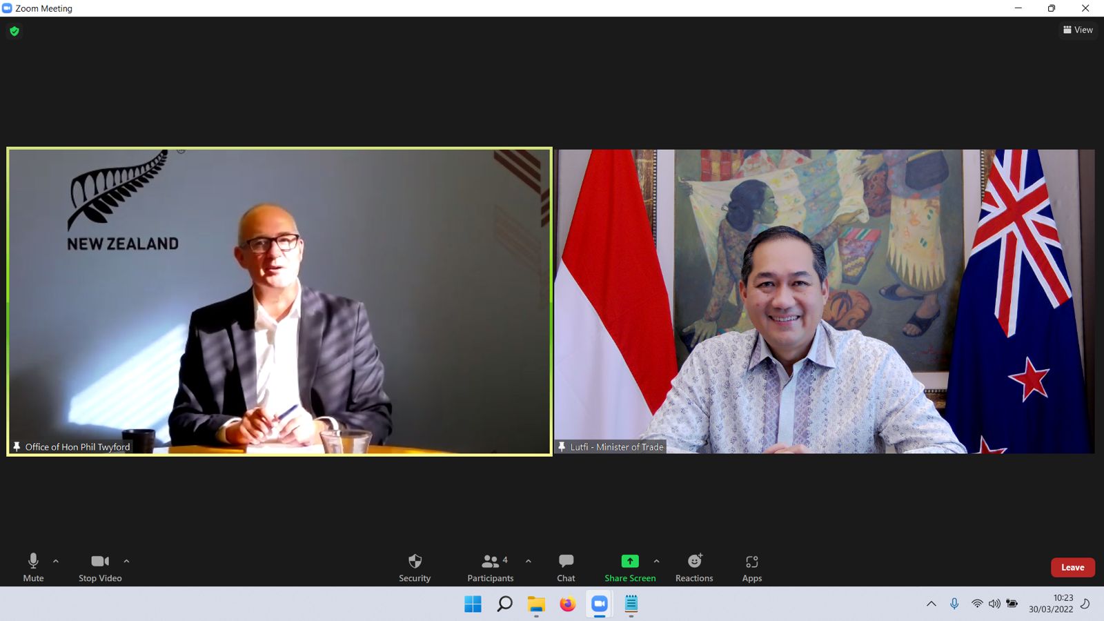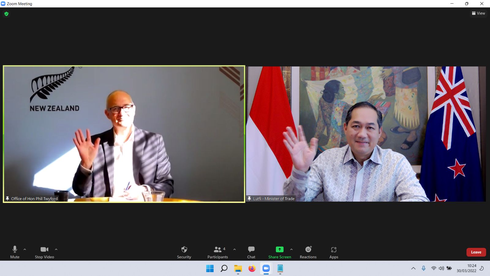 Menteri Perdagangan RI, Muhammad Lutfi melakukan pertemuan dengan Menteri Perdagangan dan Pertumbuhan Ekspor Selandia Baru, Phil Twyford yang berlangsung secara virtual di Jakarta, Rabu (30 Maret).