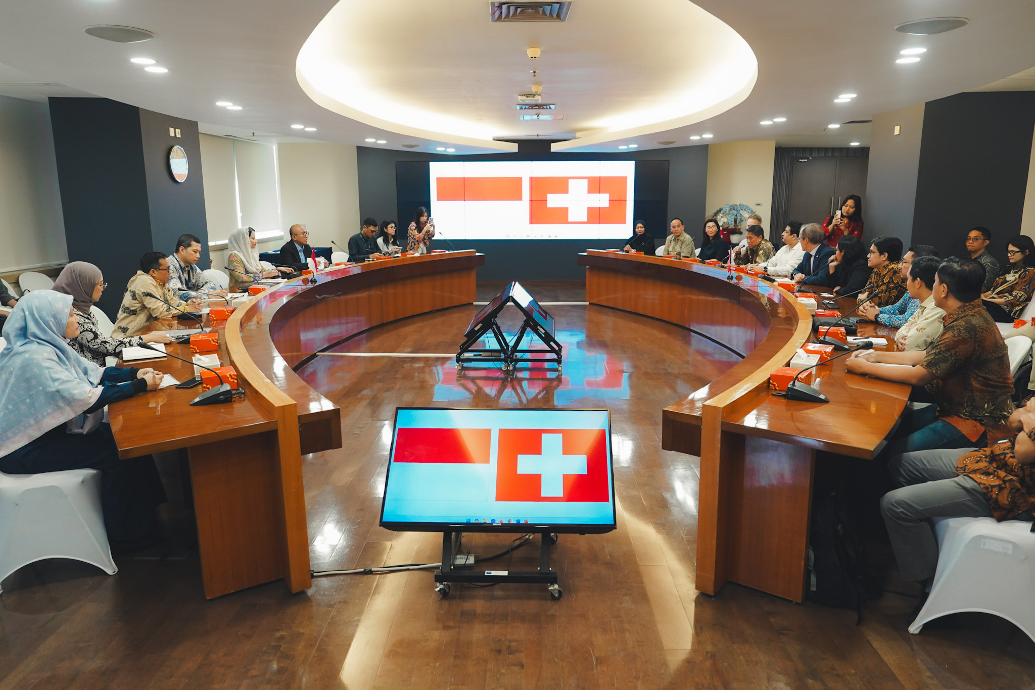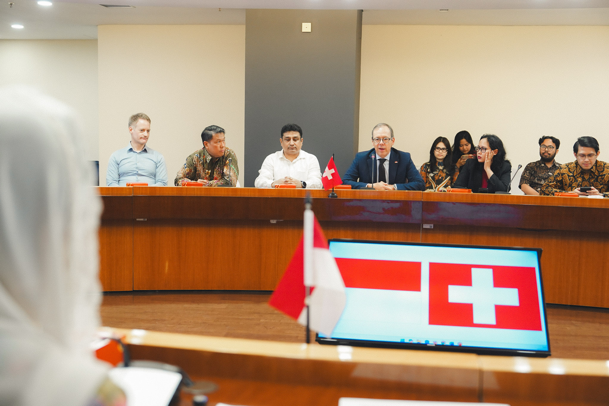 Pertemuan ini membahas peningkatan hubungan perdagangan Indonesia dan Swiss, implementasi Indonesia-EFTA CEPA, dan persyaratan sertifikasi halal untuk barang konsumsi dan kosmetik.