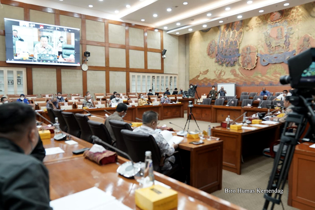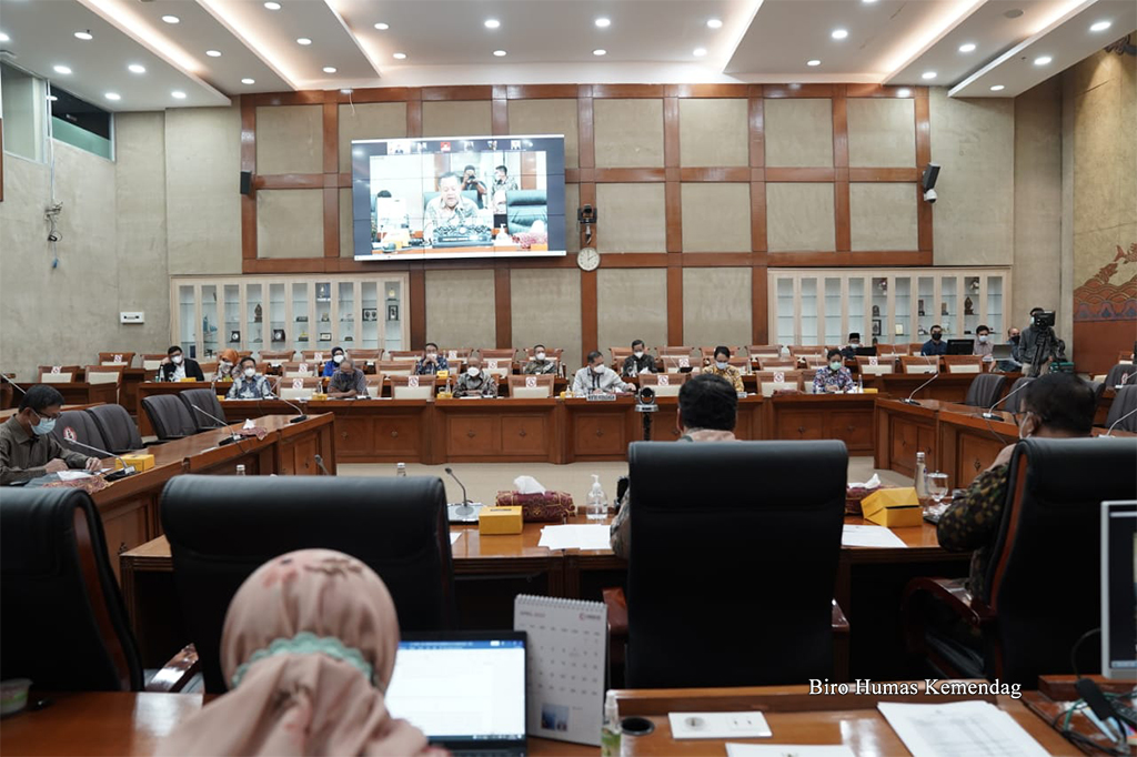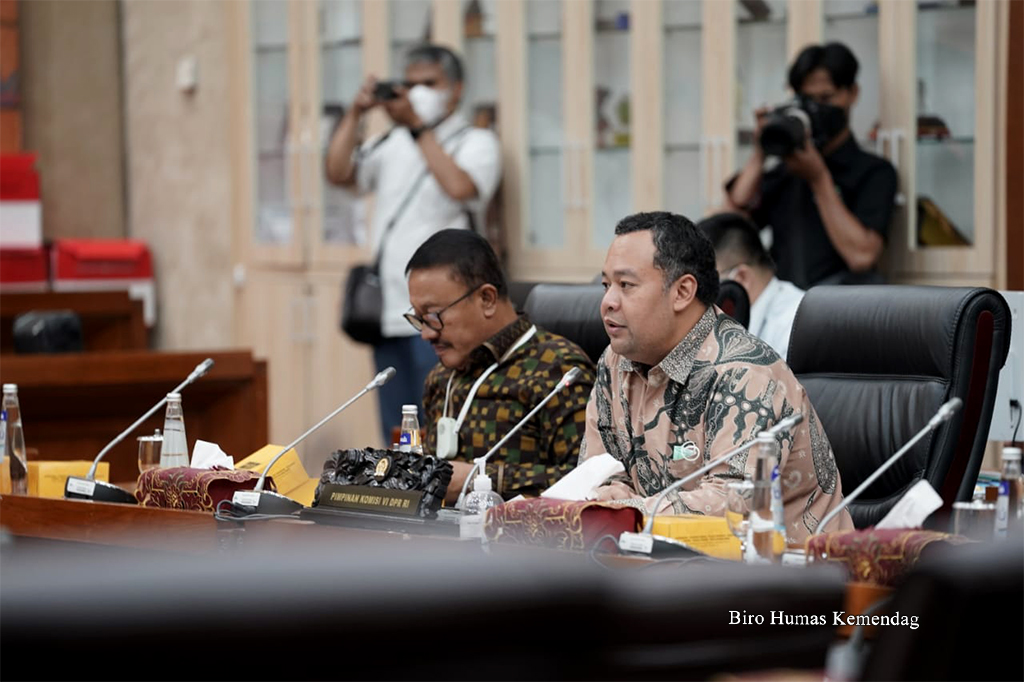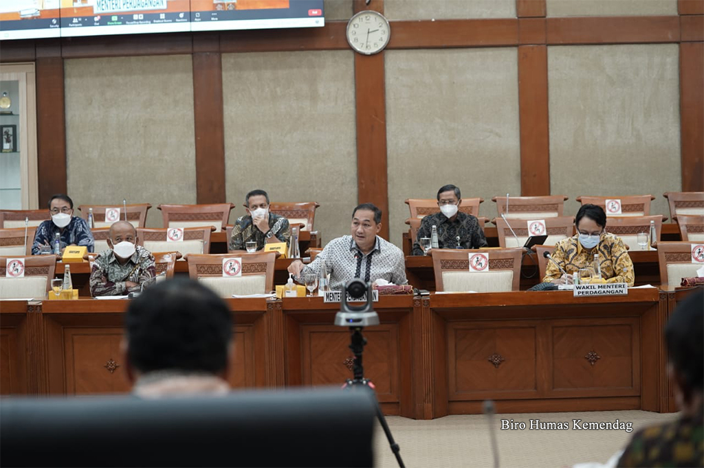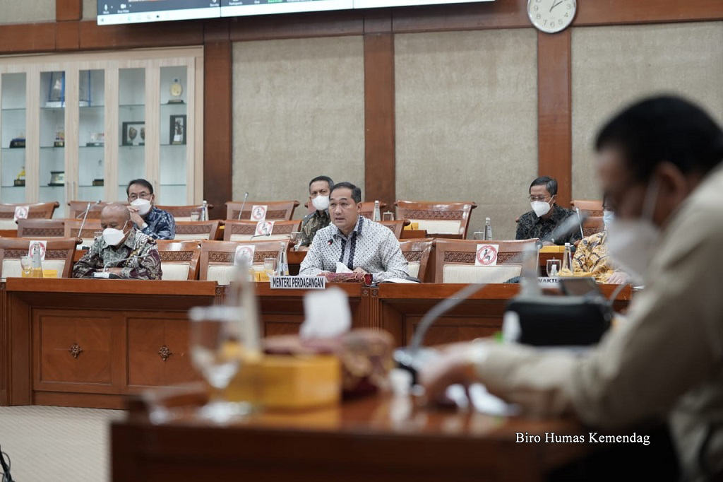 Menteri Perdagangan, Muhammad Lutfi bersama Wakil Menteri Perdagangan, Jerry Sambuaga dan jajaran Kementerian Perdagangan melakukan rapat kerja dengan Komisi VI DPR RI tentang stabilisasi harga dan pasokan barang kebutuhan pokok (bapok) menjelang puasa dan Lebaran di Gedung DPR RI, Jakarta, Kamis (17 Mar). Rapat kerja tersebut dipimpin oleh Wakil Ketua Komisi VI DPR RI, Mohamad Hekal.
