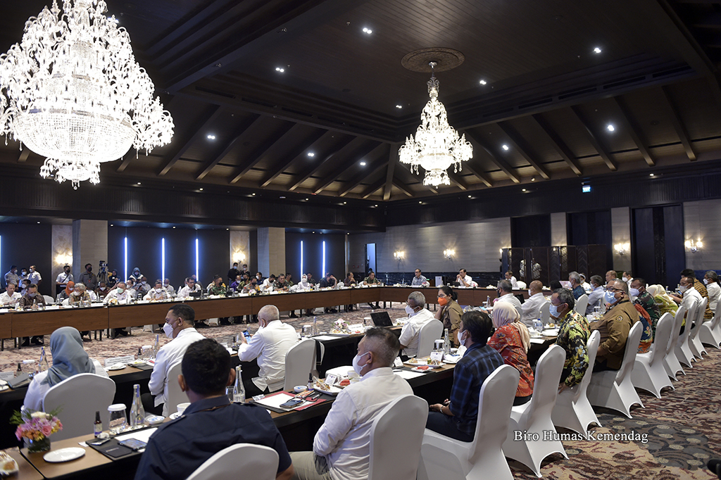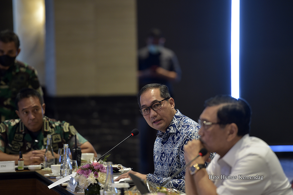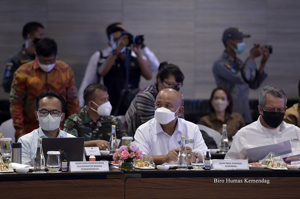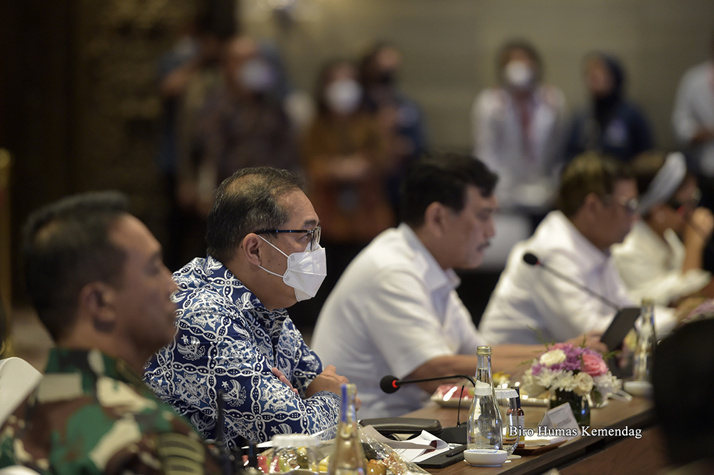 Menteri Perdagangan, Muhammad Lutfi bersama Menteri Koordinator Bidang Politik, Hukum dan Keamanan, Mahfud MD; Menteri Luar Negeri, Retno Marsudi serta Panglima TNI, Andika Perkasa menghadiri Rapat Koordinasi Penyelenggaraan Presidensi G20 Indonesia yang berlangsung di Bali, Rabu (23 Maret). Rakor tersebut dipimpin Menteri Koordinator Kemaritiman dan Investasi, Luhut Binsar Pandjaitan.