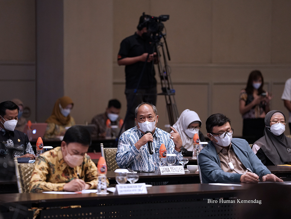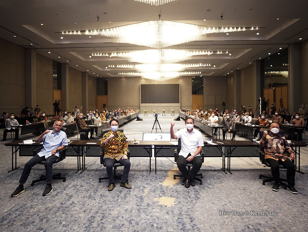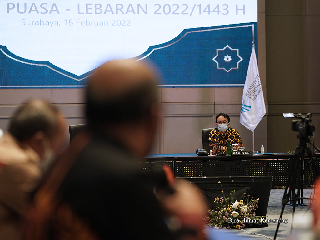 Kementerian Perdagangan menggelar Rapat Koordinasi Nasional Stabilisasi Harga dan Ketersediaan Pasokan Barang Kebutuhan Pokok Menjelang Puasa dan Lebaran 2022/1443 H yang berlangsung di Surabaya, Jawa Timur, Jumat (18 Feb). Dalam kesempatan tersebut, Menteri Perdagangan, Muhammad Lutfi didampingi Wakil Menteri Perdagangan, Jerry Sambuaga; Sekretaris Jenderal Kemendag, Suhanto serta Direktur Jenderal Perdagangan Dalam Negeri Kemendag, Oke Nurwan membuka sekaligus memberikan arahan dalam acara tersebut.
