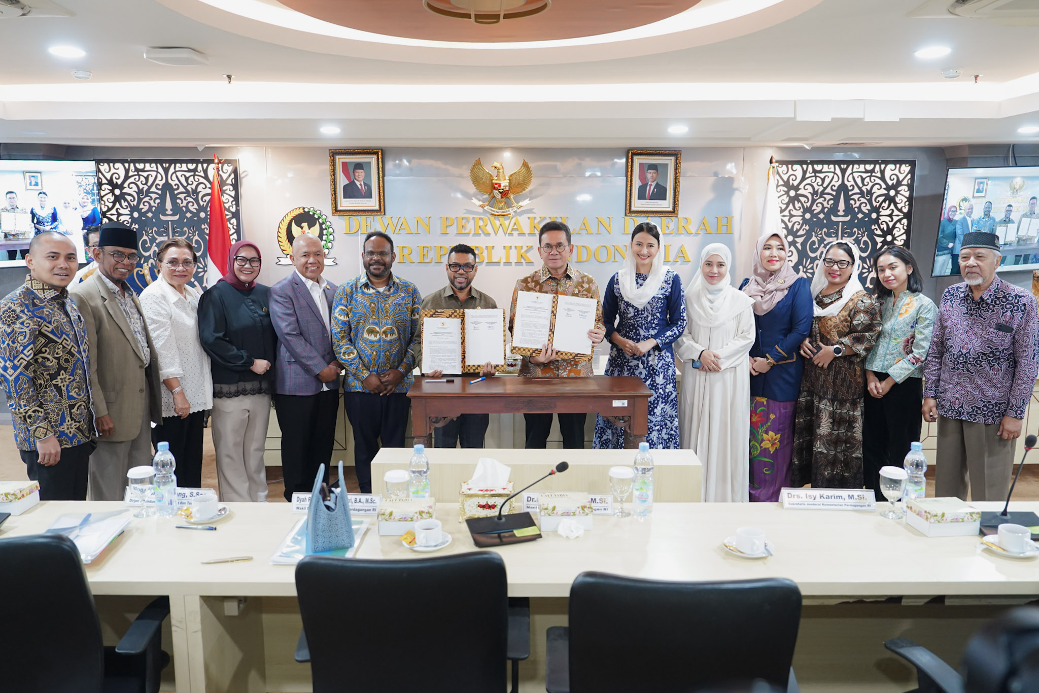Menteri Perdagangan, Budi Santoso dan Wakil Menteri Perdagangan, Dyah Roro Esti menghadiri rapat kerja bersama Komite III DPD RI di Gedung DPD RI, Jakarta, Selasa (7 Apr). Rapat dipimpin oleh Ketua Komite III DPD RI, Filep Wamafma.