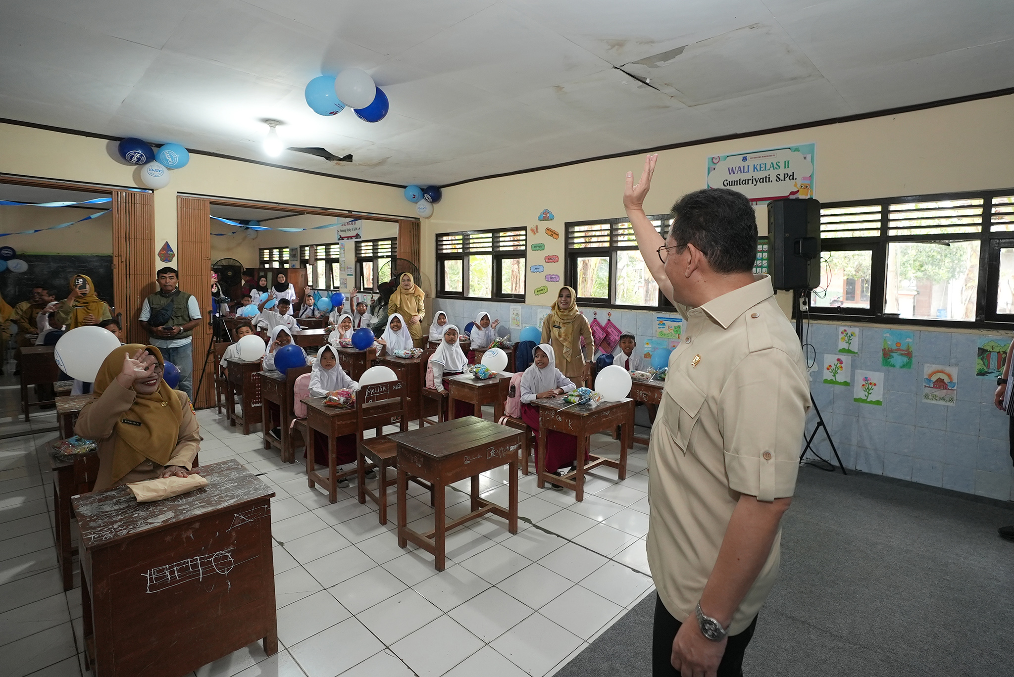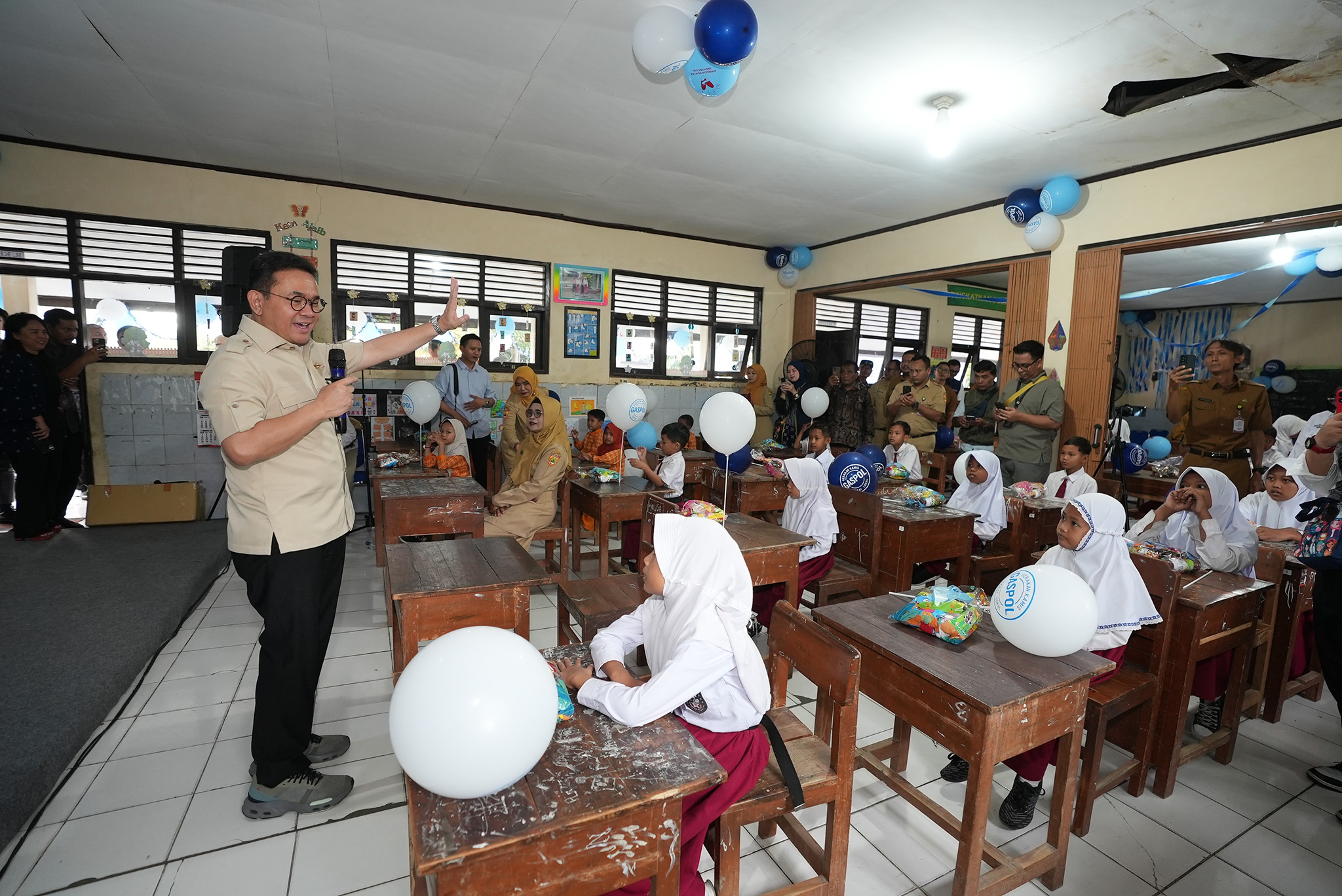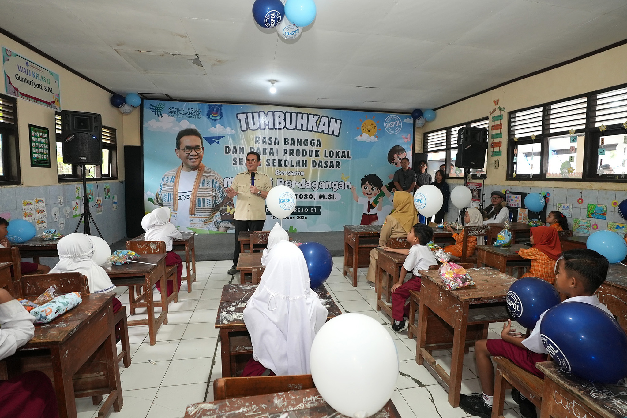 Menteri Perdagangan, Budi Santoso melakukan sosialisasi program Bangga Buatan Indonesia (BBI)-GASPOL di SDN Sonorejo 01, Sukoharjo, Jawa Tengah, Selasa (10 Feb).