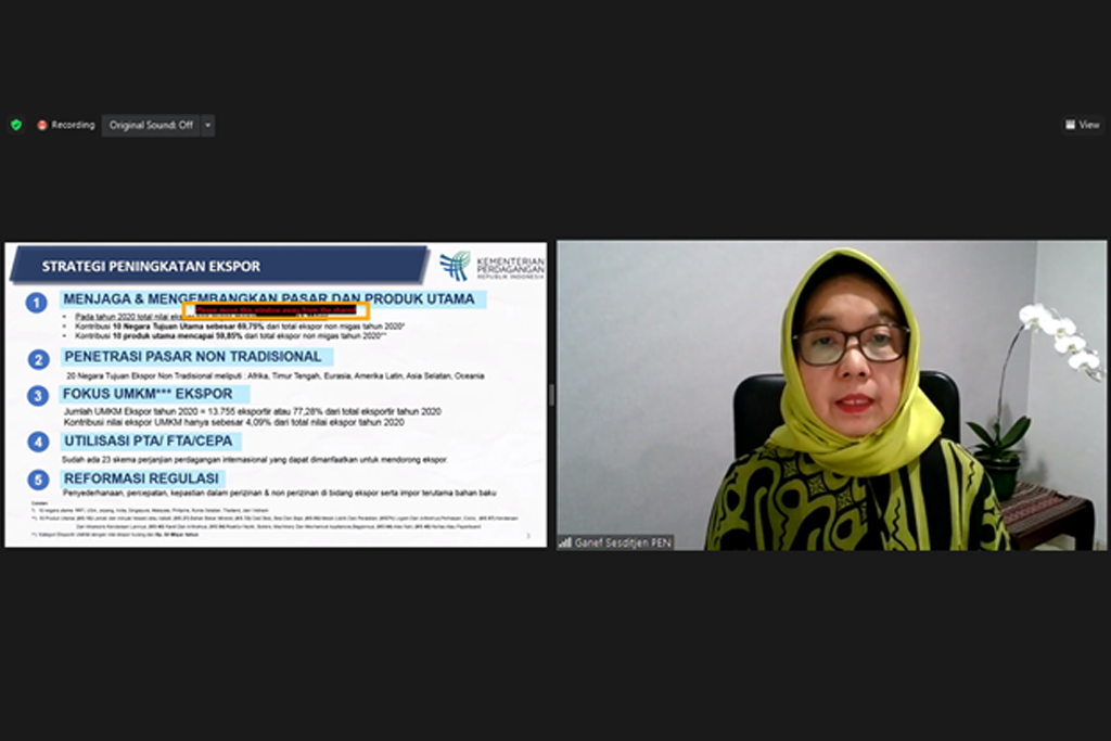 Sekretaris Ditjen Pengembangan Ekspor Nasional, Ganef Judawati membuka secara virtual kegiatan Sosialisasi Export Center Surabaya (ECS) yang digelar di Pamekasan, Madura, Jawa Timur, pada Kamis, (18 Nov). Kegiatan ini ditujukan untuk mendorong ekspor pelaku UKM, khususnya yang berorientasi ekspor.