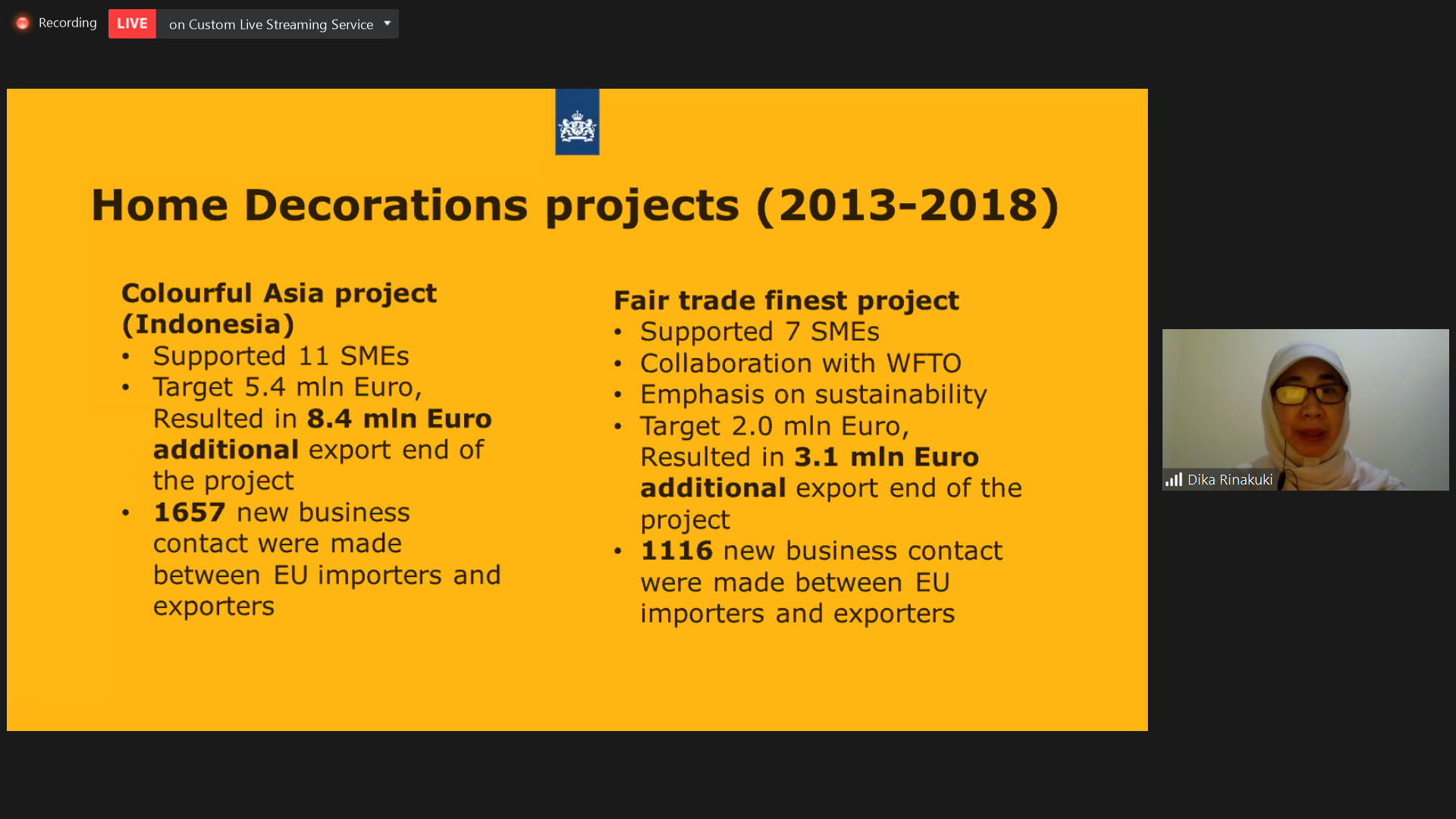 Sementara, Direktur Kerja Sama Pengembangan Ekspor, Marolop Nainggolan melaporkan bahwa sosialisasi daring yang sama akan diselenggarakan bagi pelaku usaha produk dekorasi rumah di Jawa Tengah dan D.I. Yogyakarta, Jawa Timur dan Bali, Sumatra, serta Kalimantan, NTB, NTT, Sulawesi, Papua, Maluku akan berlangsung pada 21--26 Oktober 2020.