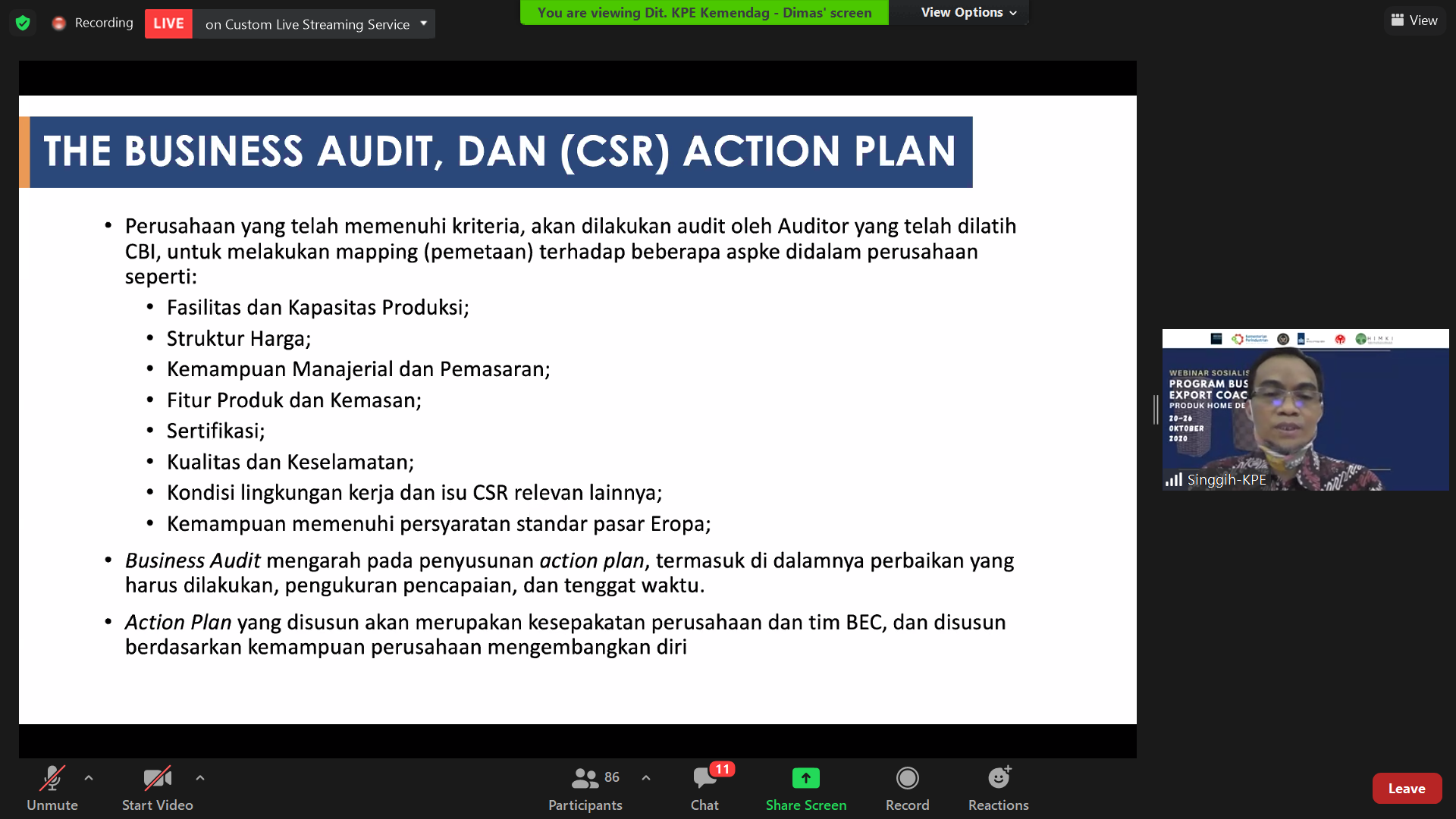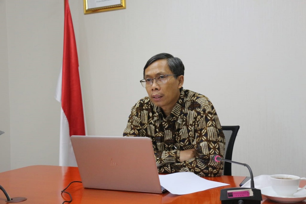 Direktur Jenderal Pengembangan Ekspor Nasional, Kasan memberikan sambutan pada acara Sosialisasi Daring Program Local Business Export Coaching Produk Home Decoration yang merupakan kerja sama Ditjen Pengembangan Ekspor Nasional Kementerian Perdagangan dengan CBI Belanda kepada pelaku usaha produk dekorasi rumah di Provinsi DKI Jakarta, Jawa Barat, dan Banten, pada Selasa (20 Okt).