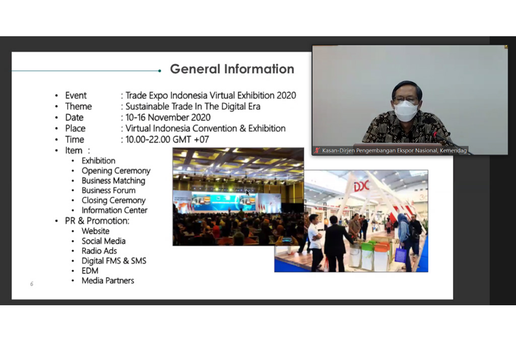 Kementerian Perdagangan terus melakukan sosialisasi penyelenggaraan Trade Expo Indonesia-Virtual Exhibition (TEI-VE) 2020. Sosialisasi kali ini dilakukan kepada perwakilan pemerintah daerah dan Bank Indonesia, serta dipimpin oleh Dirjen Pengembangan Ekspor Nasional, Kasan, pada Jumat (2 Okt).