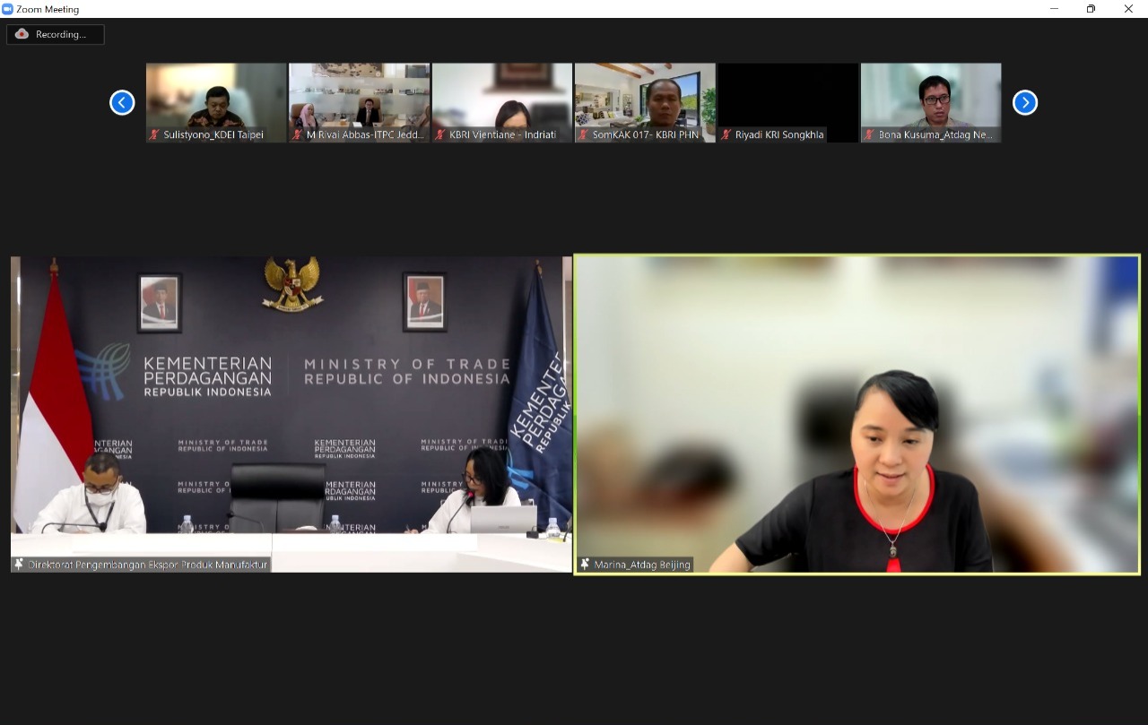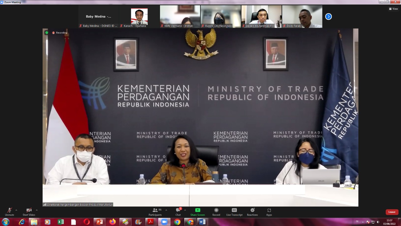 Dalam rangka menggalang buyer luar negeri dari kawasan Asia Pasifik, Direktur Pengembangan Ekspor Produk Manufaktur, Ni Made Ayu Marthini memimpin Sosialisasi Trade Expo Indonesia (TEI) 2022 bersama kedutaan besar, konsulat jenderal, dan perwakilan perdagangan di wilayah Asia dan Pasifik pada Rabu (3 Agt).