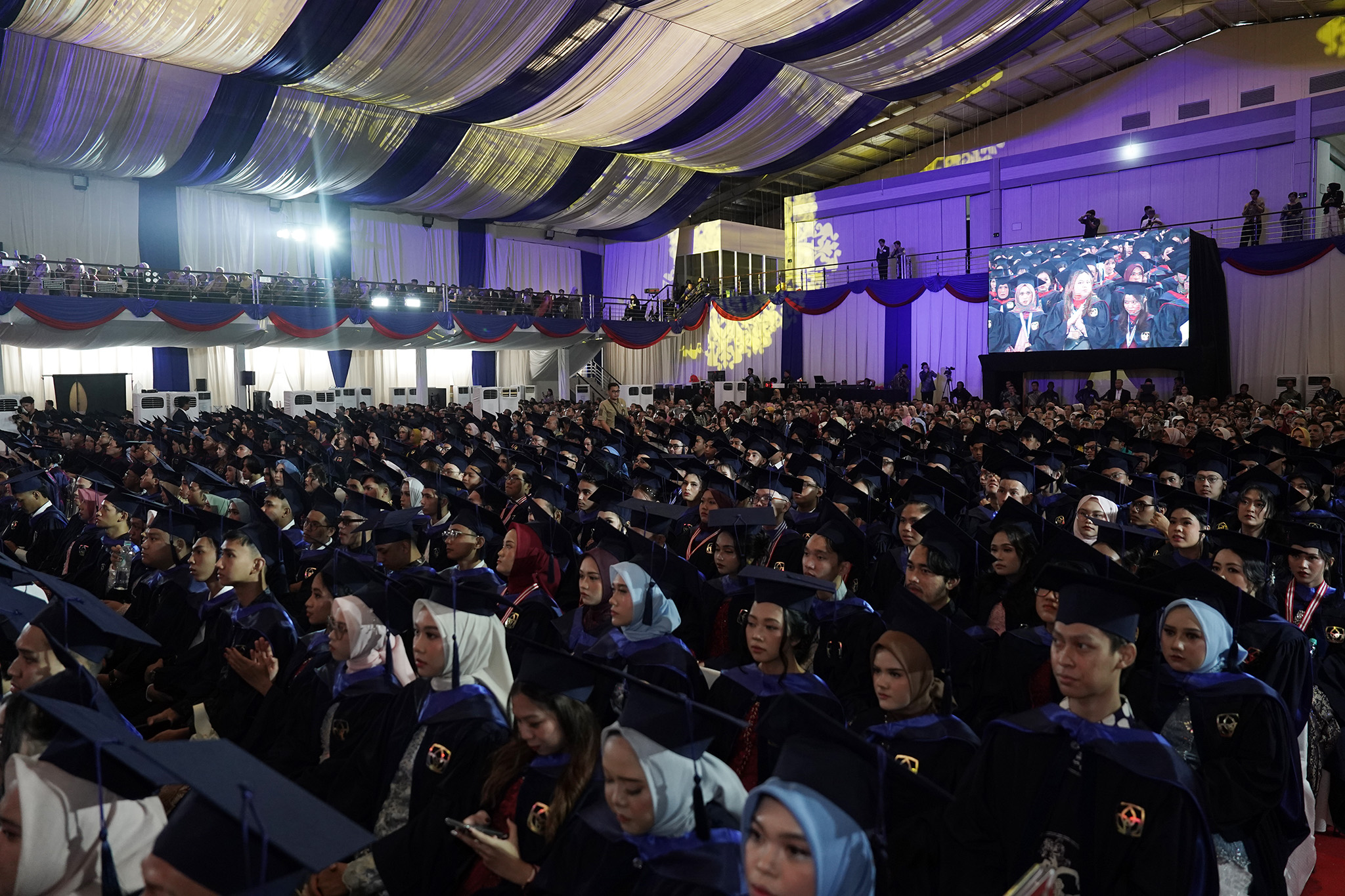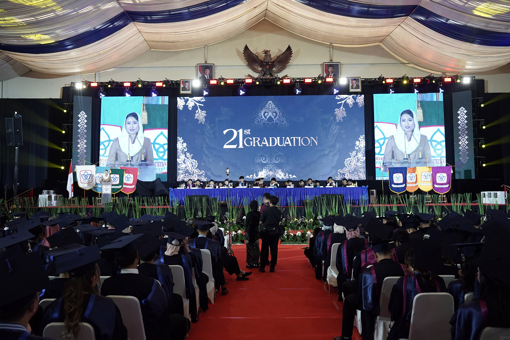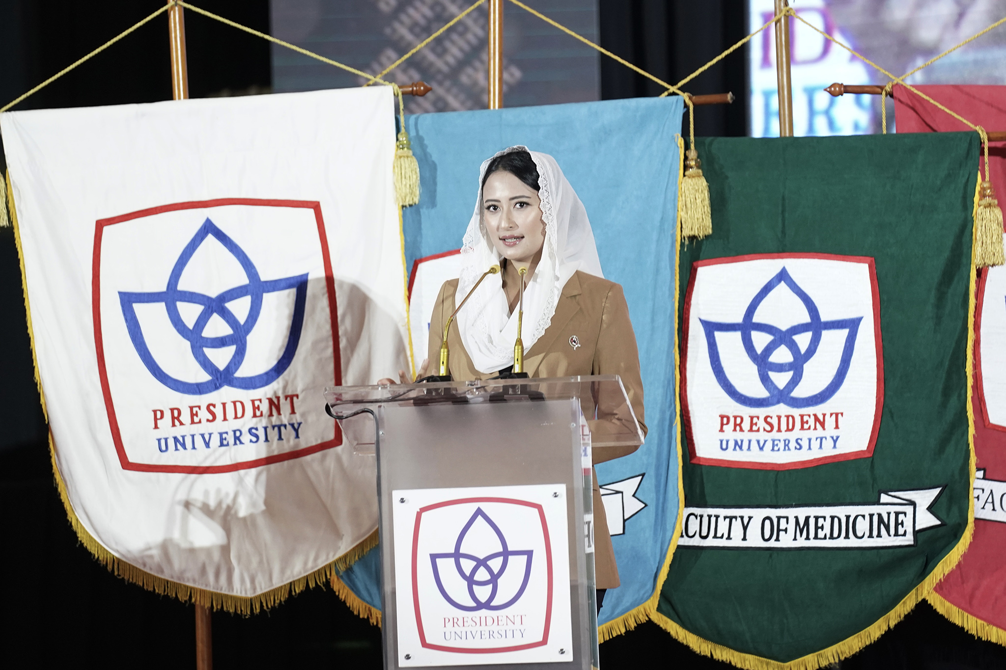 Wakil Menteri Perdagangan, Dyah Roro Esti memberikan sambutan pada acara Wisuda ke-21 Program Pasca-Sarjana, Sarjana, dan Diploma President University di Cikarang, Jawa Barat, Minggu (14 Des).