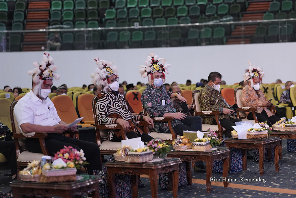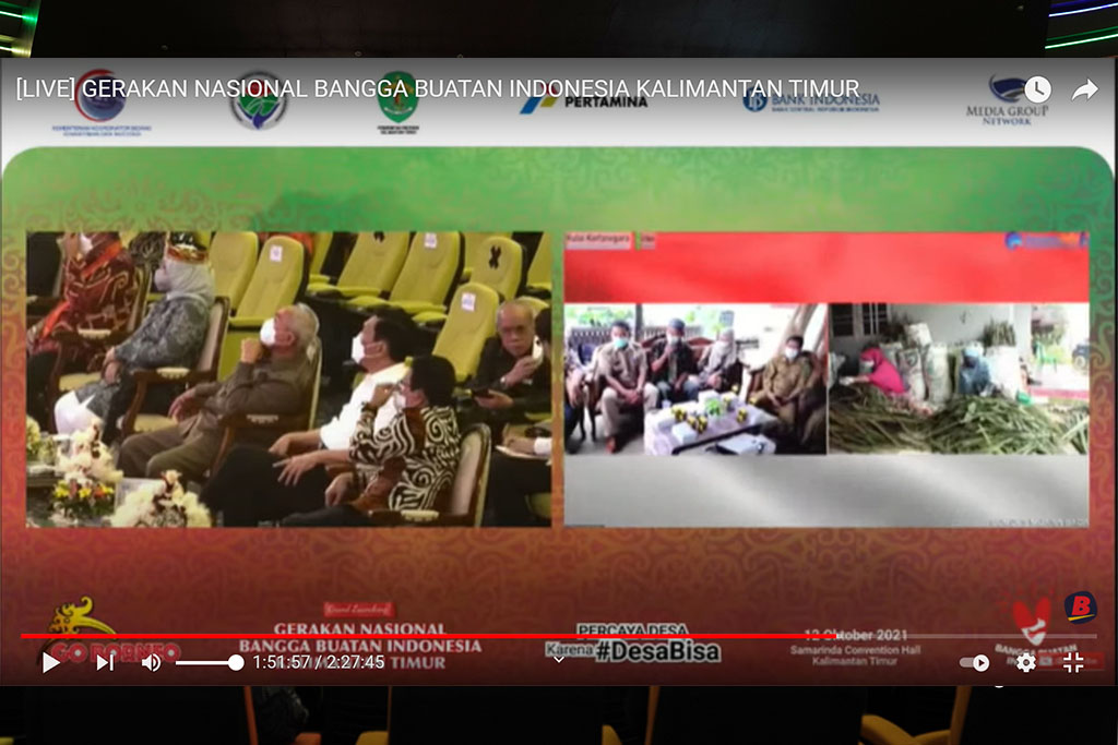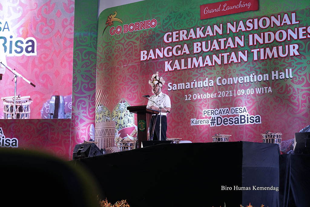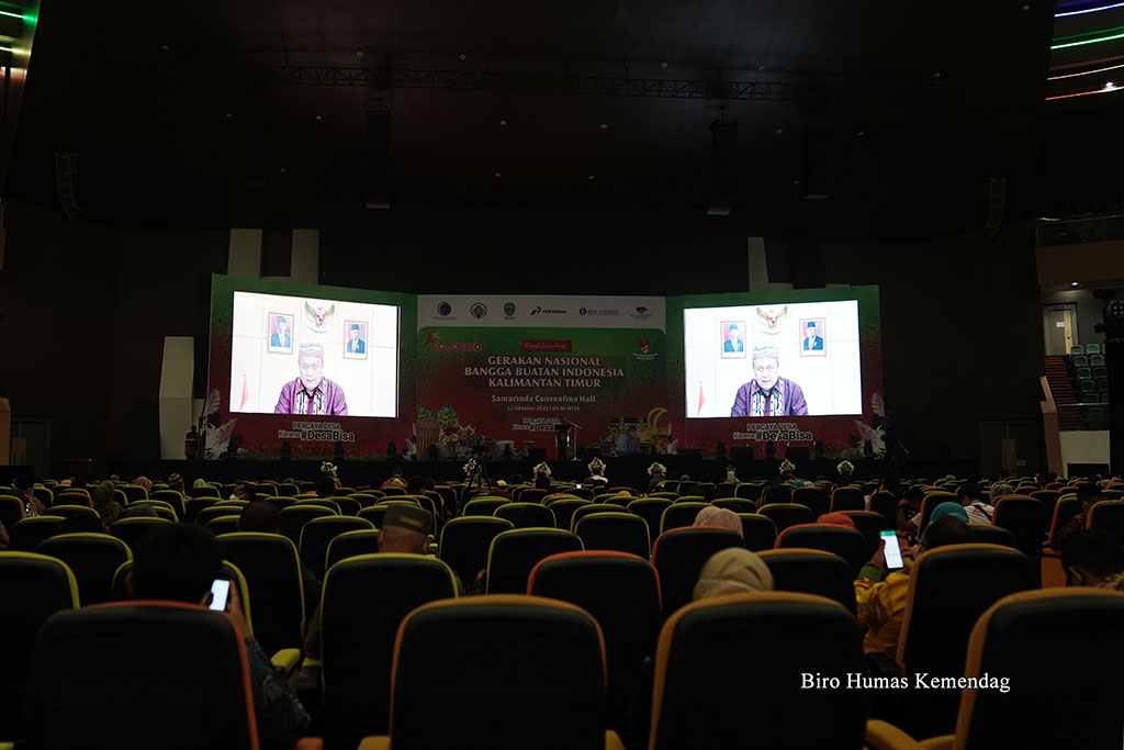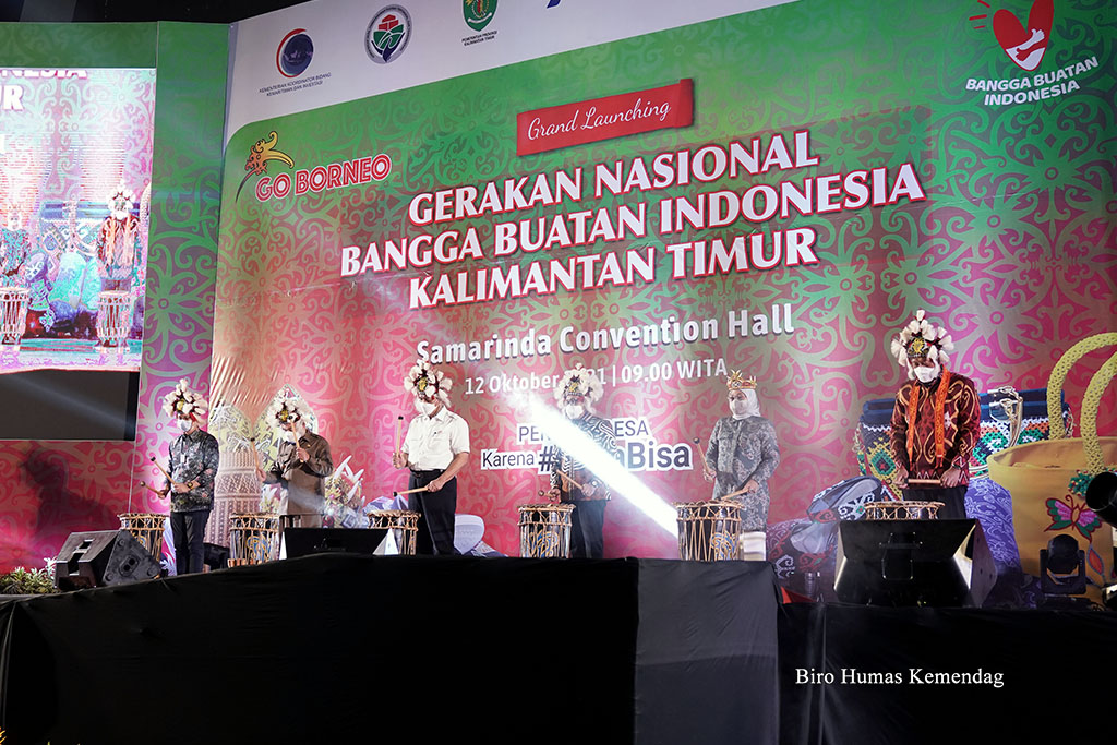 Kegiatan Peresmian Gerakan Nasional Bangga Buatan Indonesia Kalimantan Timur ditandai oleh penabuhan gendang oleh Wamendag bersama para menteri yang hadir dan disaksikan secara virtual oleh Menteri Koperasi dan UKM, Teten Masduki.