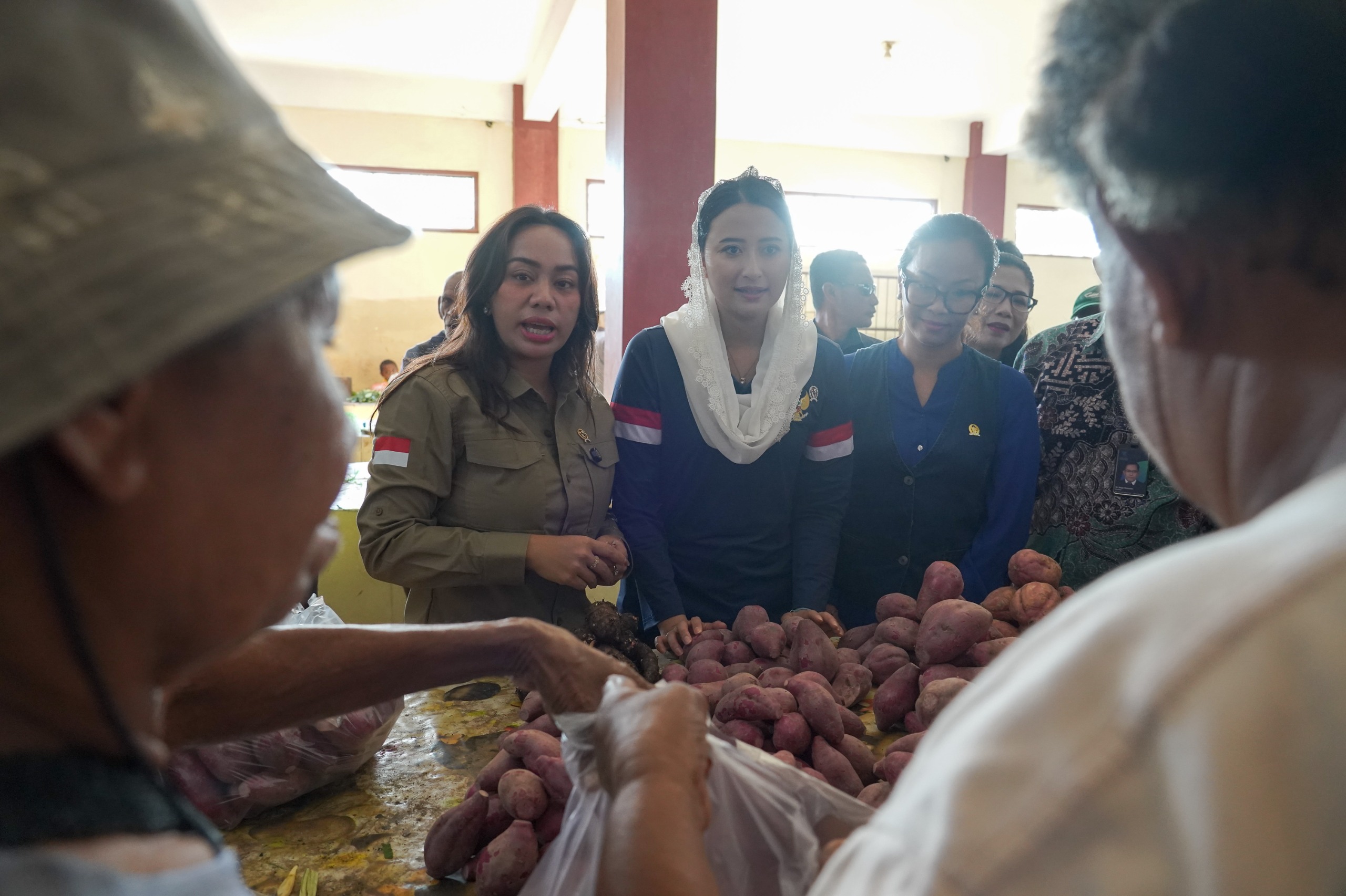 Wakil Menteri Perdagangan, Dyah Roro Esti bersama Utusan Khusus Presiden (UKP) Bidang Pariwisata, Zita Anjani melakukan pemantauan barang kebutuhan pokok (bapok) di Pasar Warmon Aimas, Kabupaten Sorong, Provinsi Papua Barat Daya, Jumat (19 Des).