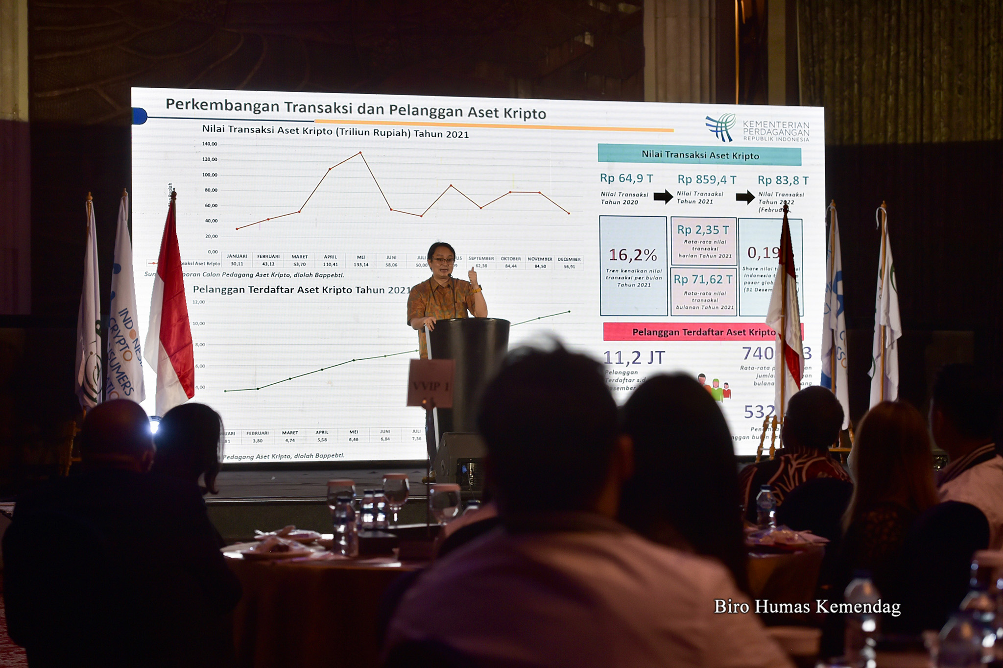Dalam sambutannya, Wamendag mengatakan bahwa perkembangan perdagangan aset kripto dinilai makin menarik dari tahun ke tahun. Kemendag mencatat nilai transaksi aset kripto di Indonesia sebesar Rp64,9 triliun pada 2020 dan tercatat Rp859,4 triliun pada 2021. Adapun pada periode Januari-Februari 2022, tercatat Rp83,8 triliun.