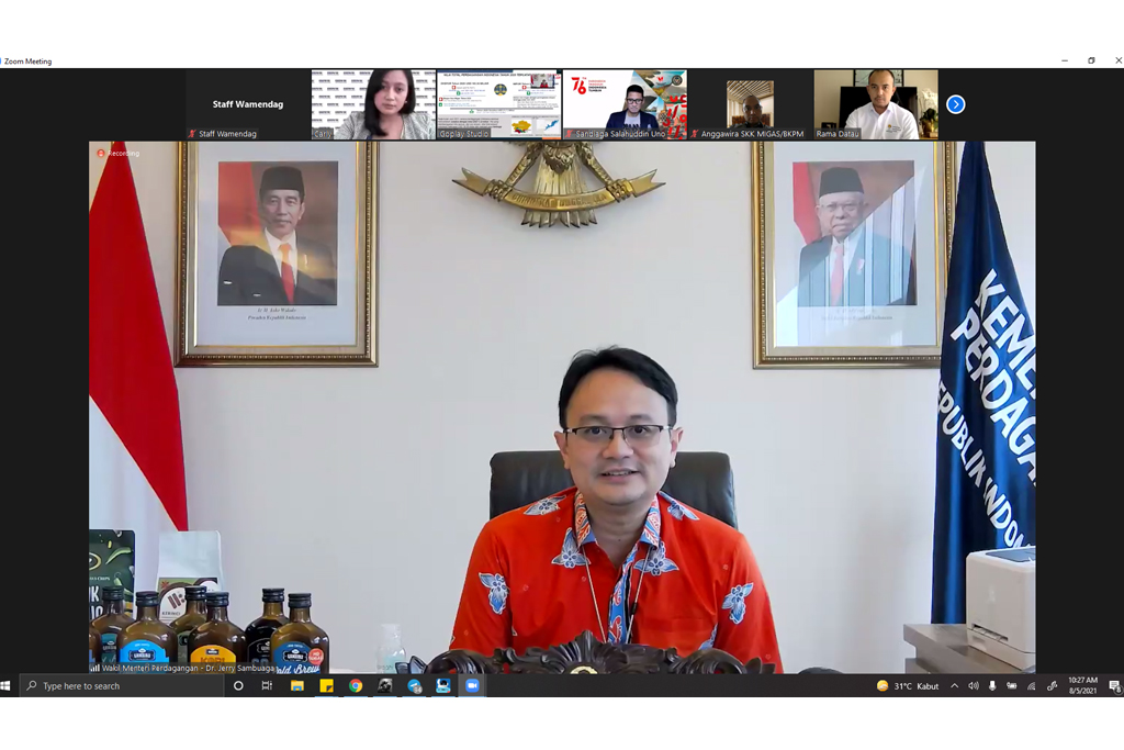 Wakil Menteri Perdagangan, Jerry Sambuaga menghadiri gelar wicara Gerakan Cinta Ekspor Produk Indonesia secara virtual di Jakarta, Kamis (5 Agustus).