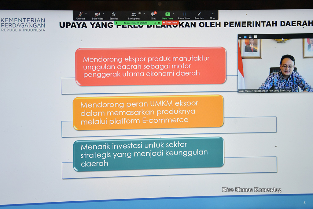 Pada kesempatan tersebut, Wamendag mengajak pemerintah daerah untuk mendorong ekspor produk manufaktur unggulan daerah sebagai motor penggerak utama ekonomi daerah, mendorong peran UKM ekspor dalam memasarkan produknya melalui platform niaga elektronik, serta menarik investasi untuk sektor strategis yang menjadi unggulan daerah.