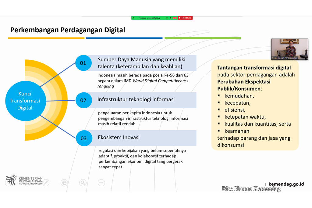 Wamendag menyatakan, tiga kunci utama dalam transformasi digital yang mendukung terciptanya ekonomi digital di Indonesia yaitu sumber daya manusia, infrastruktur, dan ekosistem inovasi.