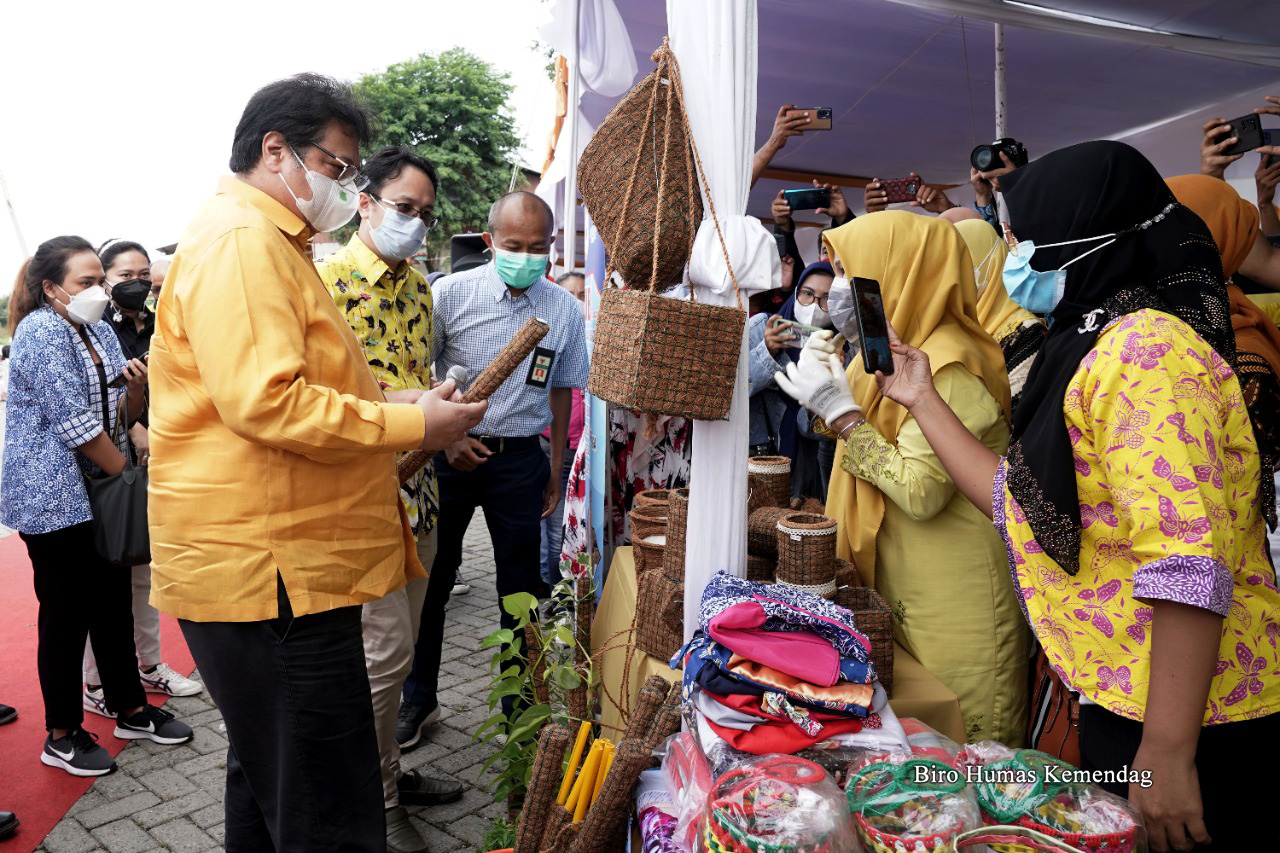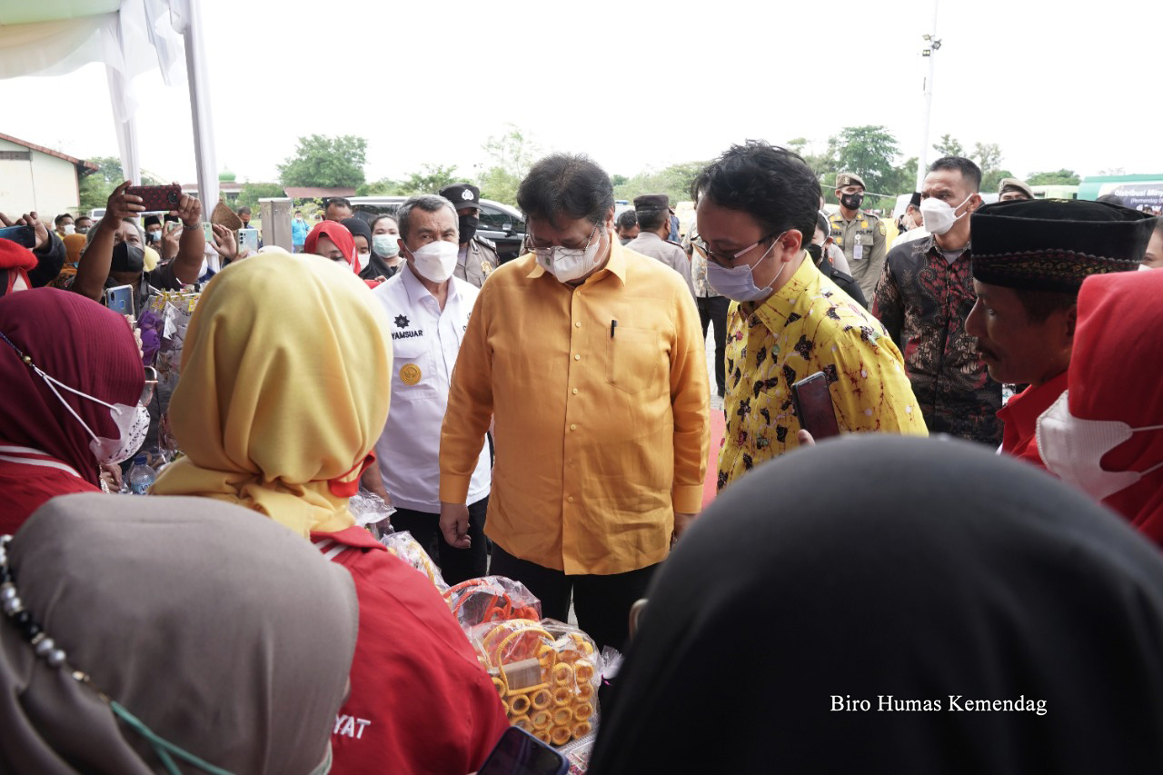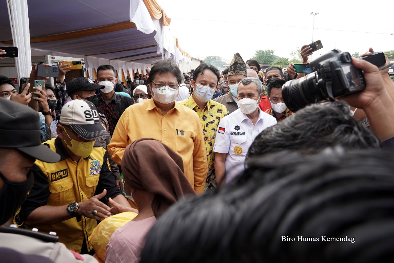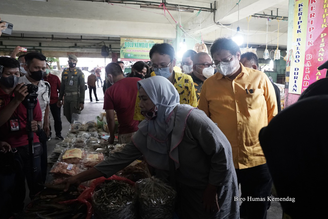 Wakil Menteri Perdagangan, Jerry Sambuaga mendampingi Menteri Koordinator Bidang Perekonomian, Airlangga Hartarto meninjau pelaksanaan operasi pasar minyak goreng di Pasar Bawah Pekanbaru, Kota Pekanbaru, Provinsi Riau, Kamis (24 Feb).