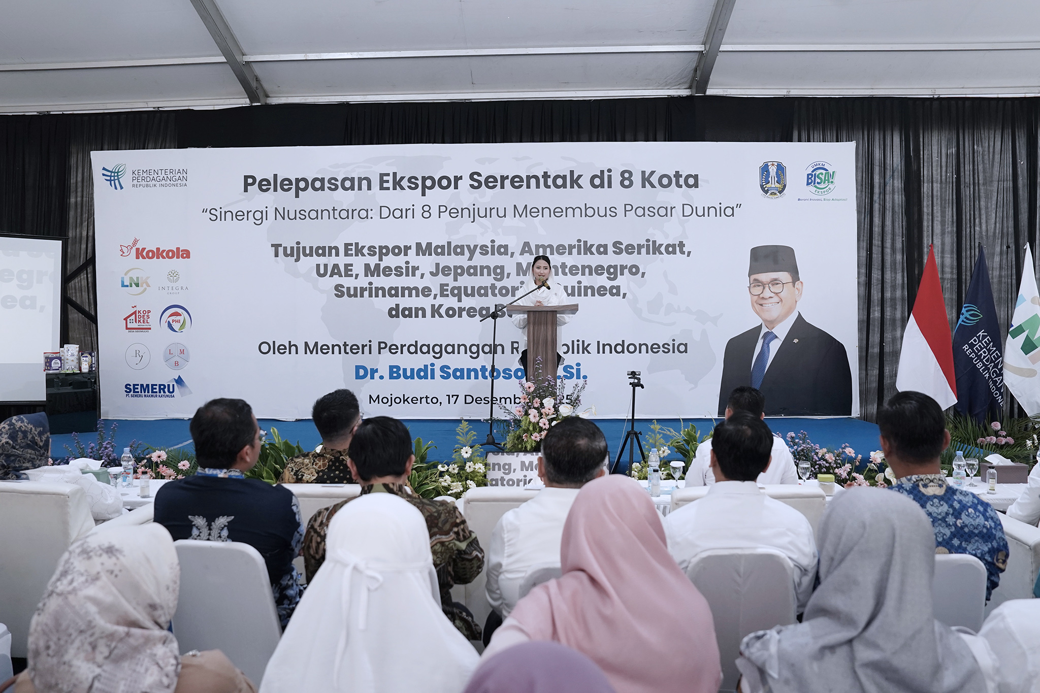 Wakil Menteri Perdagangan, Dyah Roro Esti melepas ekspor produk Provinsi Jawa Timur ke Pasar Global yang berlangsung di Mojokerto, Jawa Timur, Rabu (17 Des). Acara ini merupakan rangkaian pelepasan ekspor serentak 8 kota yang dipimpin oleh Menteri Perdagangan, Budi Santoso dari Bekasi, Jawa Barat.