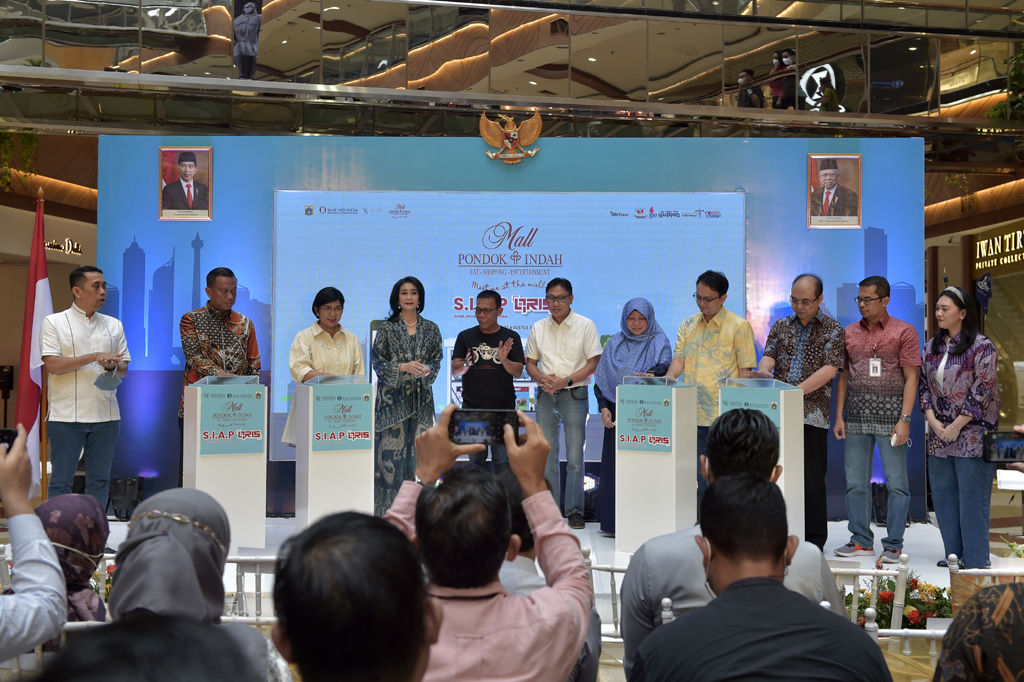 Wakil Menteri Perdagangan, Jerry Sambuaga bersama Deputi Gubernur Senior Bank Indonesia, Destri Damayanti; Kepala Kantor Perwakilan BI DKI Jakarta, Onny Widjanarko; Direktur Pengawasan Bank Kantor Regional 1 Otoritas Jasa Keuangan, Achmad Fauzi, Walikota Jakarta Selatan, Munjirin serta Anggota Komisi XI DPR RI, Masinton Pasaribu menekan tombol sebagai tanda Peluncuran S.I.A.P QRIS yang berlangsung di Mall Pondok Indah, Jakarta, Sabtu (27 Agt).