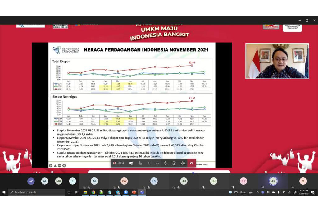 Pada kesempatan ini, Wamendag memaparkan materi tentang perkembangan terkini neraca perdagangan Indonesia pada November 2021.