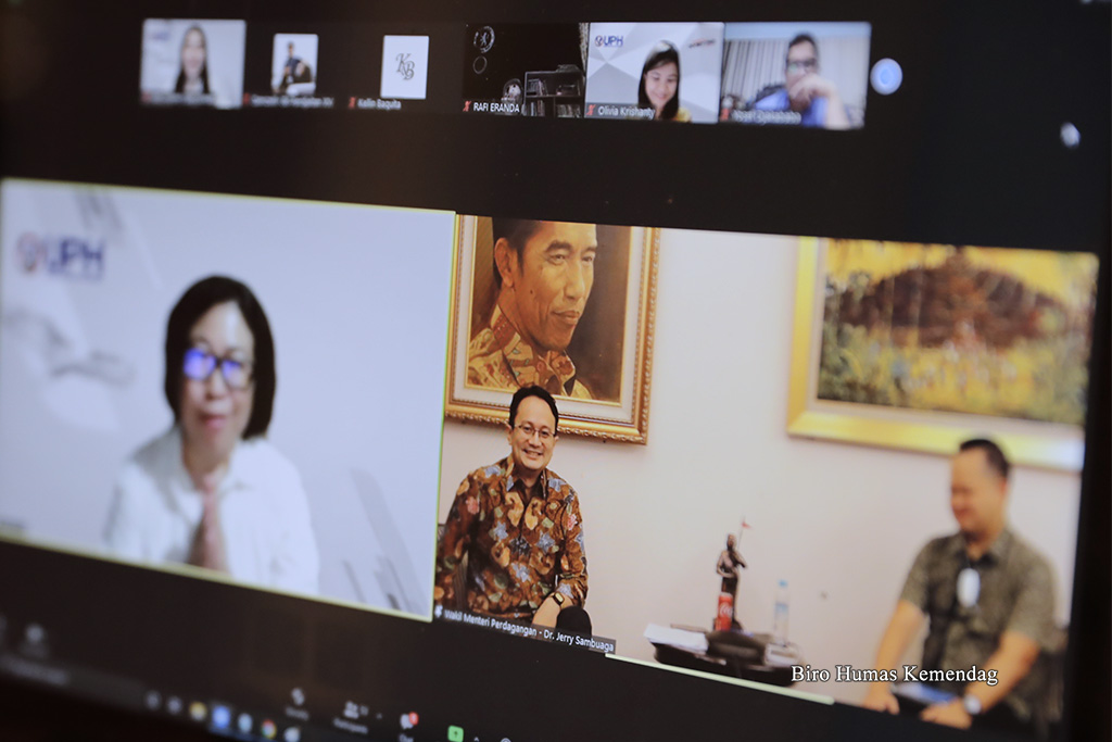 Wakil Menteri Perdagangan, Jerry Sambuaga menjadi pembicara pada Webinar Indonesia’s G20 Presidency and Global Trade in Post Pandemic Environment secara virtual, Kamis (2 Des). Acara ini terlaksana atas kerja sama Kementerian Koordinator Bidang Perekonomian dengan Universitas Pelita Harapan.