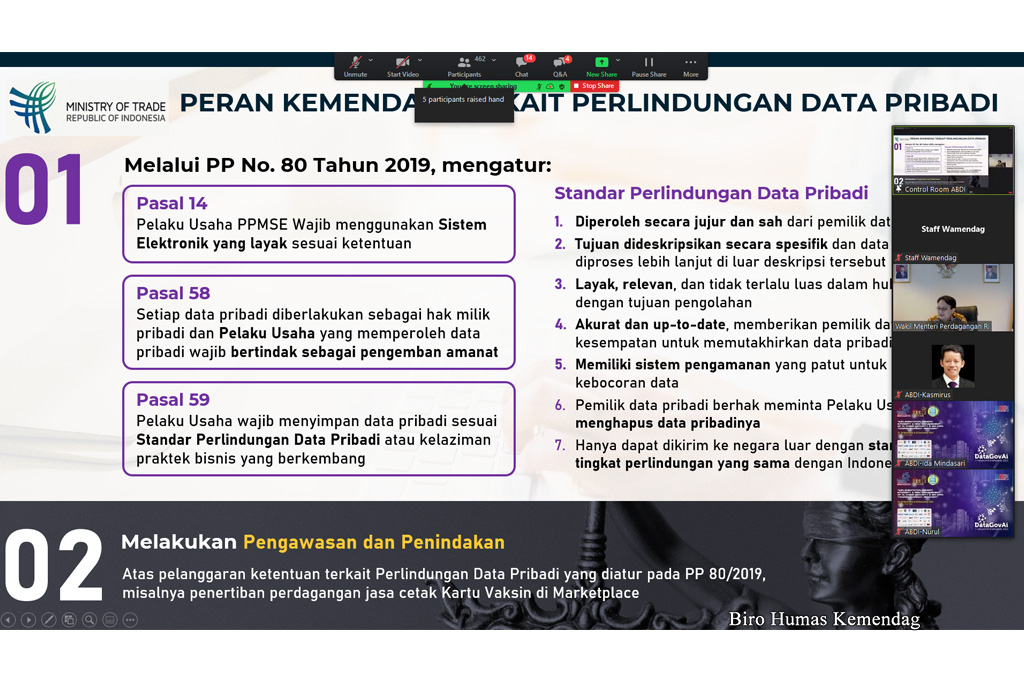 Wamendag menyatakan, aliran data yang lancar dan lintas batas sangat diperlukan untuk mendukung kegiatan perekonomian di era digital. Kepastian perlindungan data pribadi dan penggunaan data yang bertanggung jawab dapat mendorong terwujudnya “Consumer Trust dan Confidence” pada perdagangan daring.