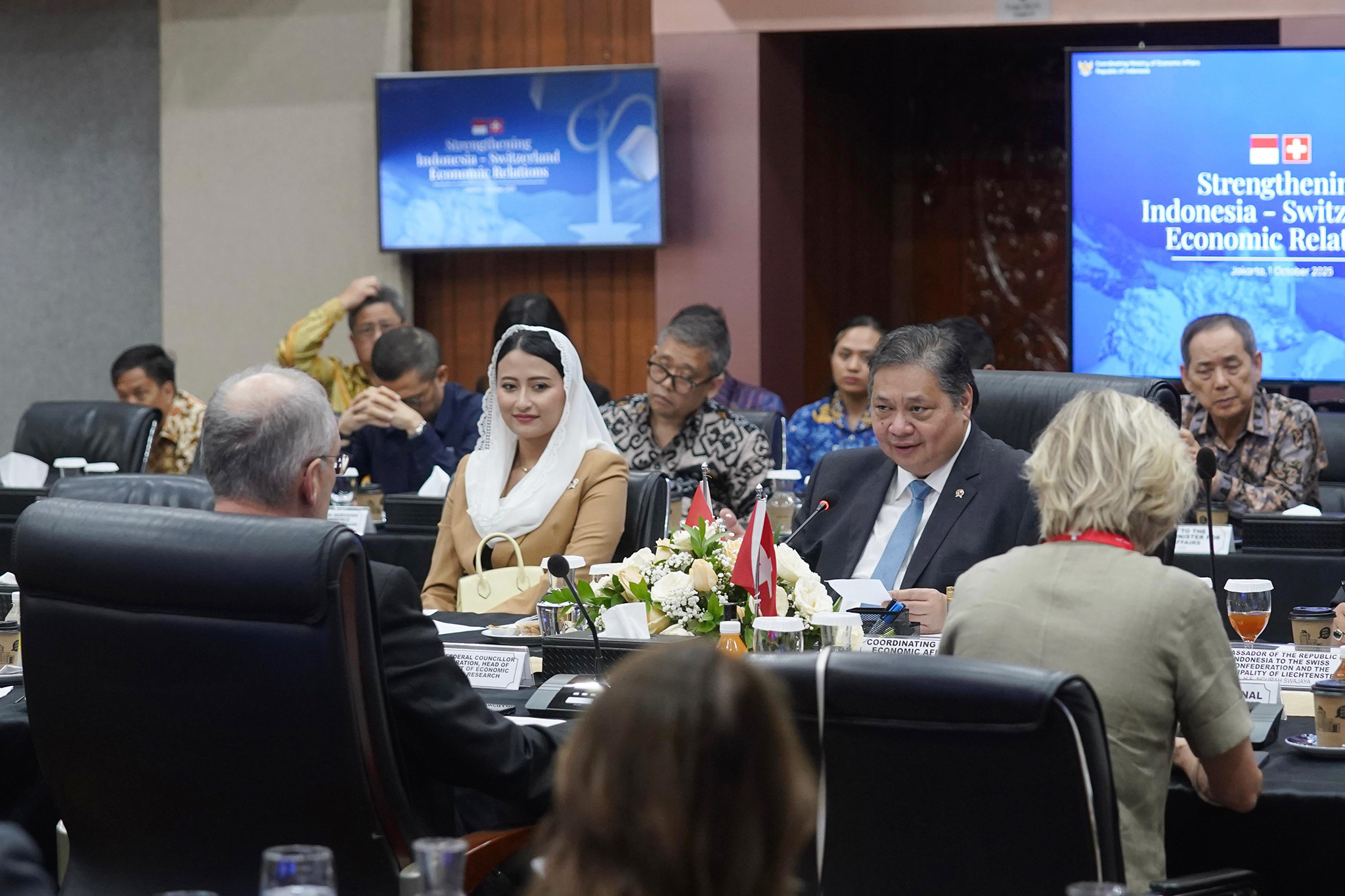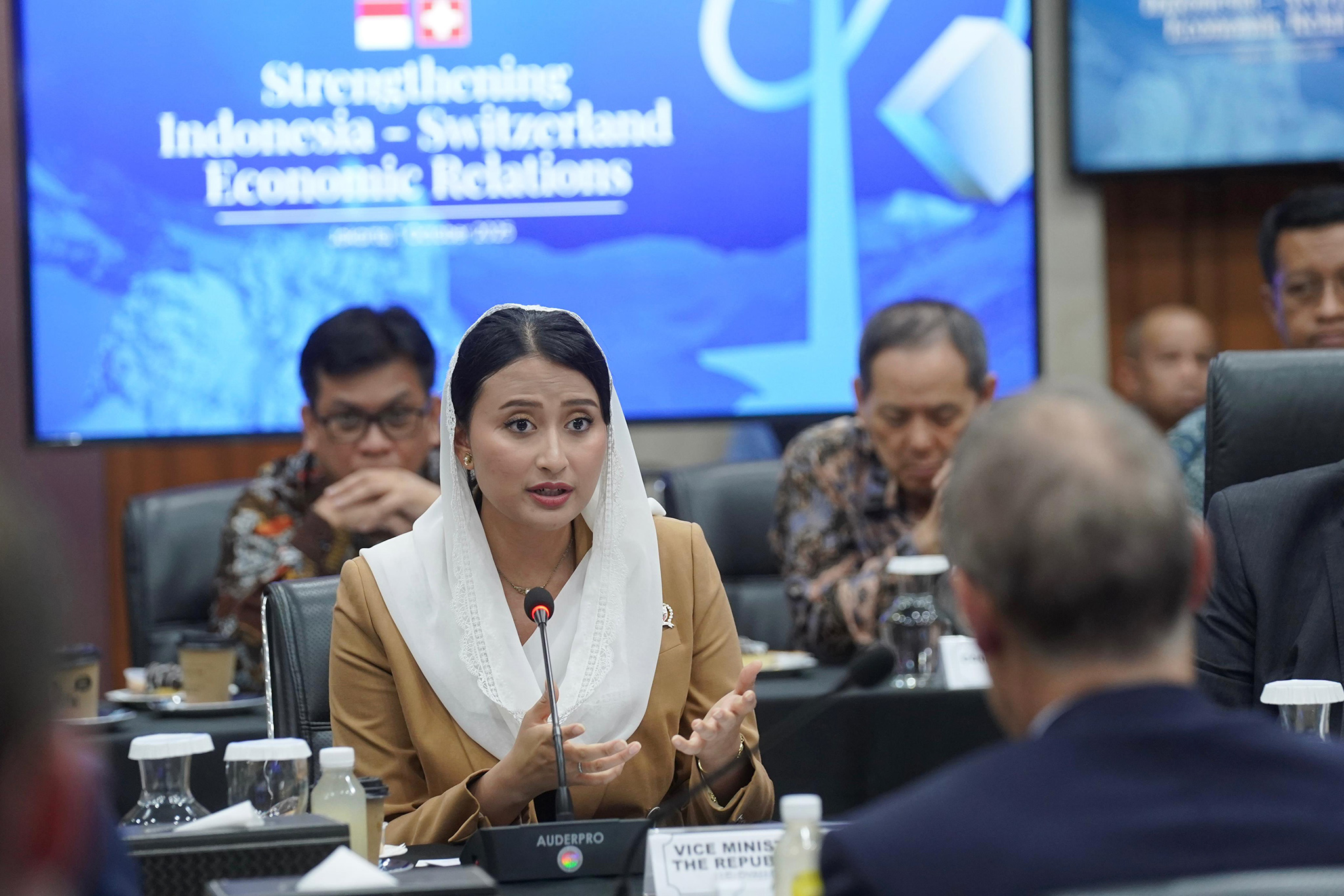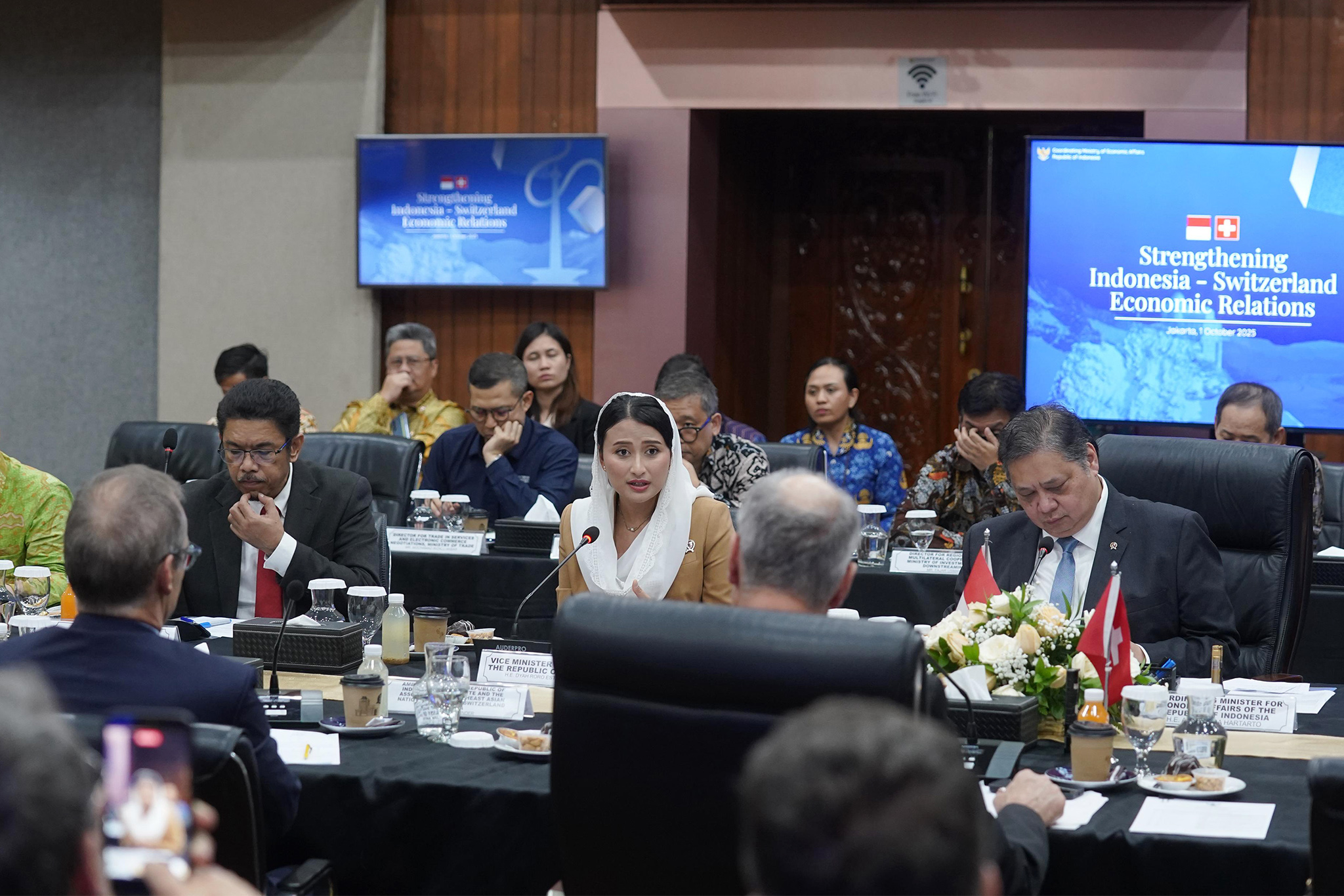 Wakil Menteri Perdagangan RI, Dyah Roro Esti mendampingi Menteri Koordinator Bidang Perekonomian RI, Airlangga Hartarto dalam Pertemuan dengan Swiss Federan Councillor and Head of Department of Economic Affairs, Education and Research, Gus Parmelin yang berlangsung di Jakarta, Rabu (1 Okt).