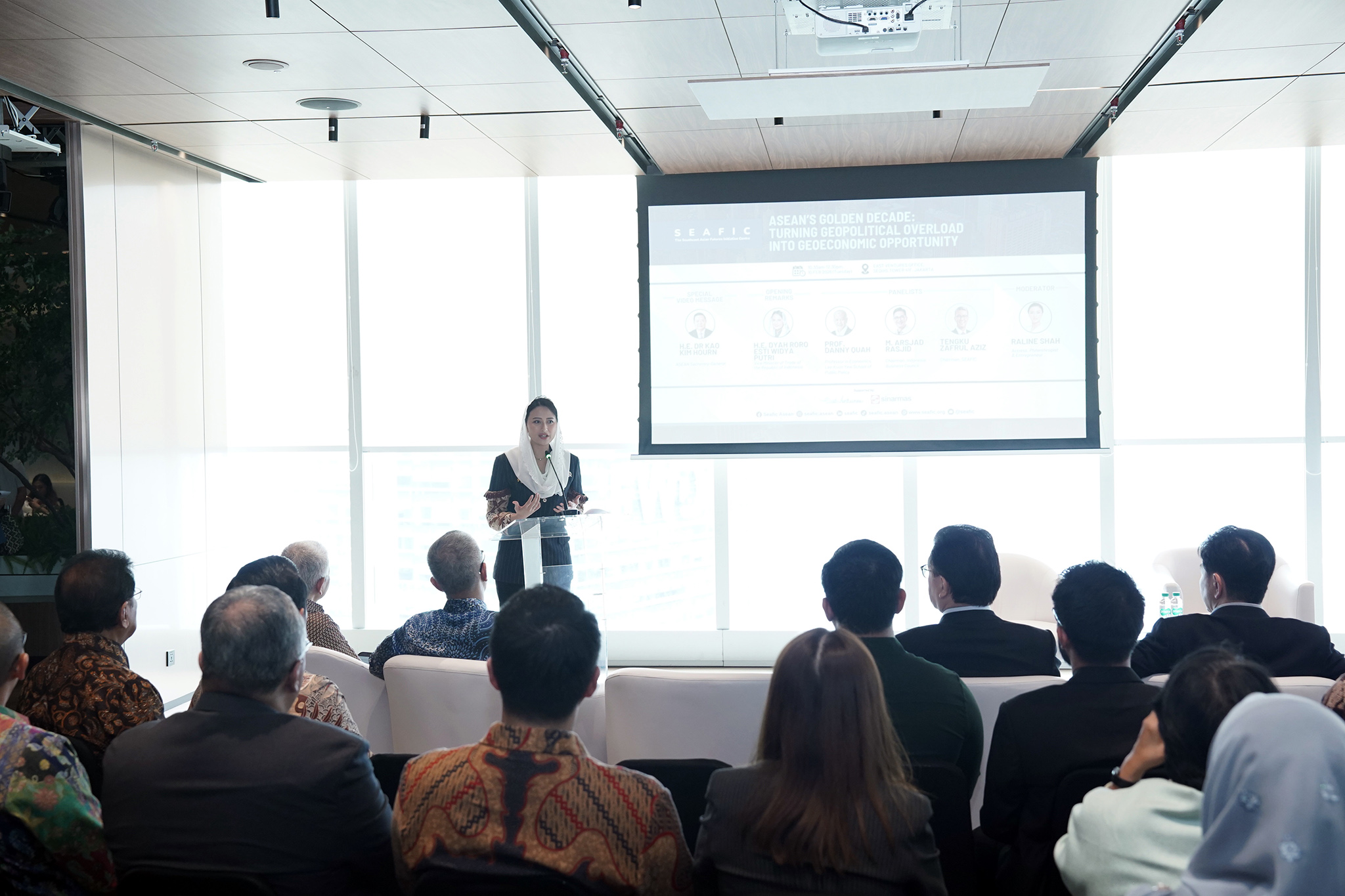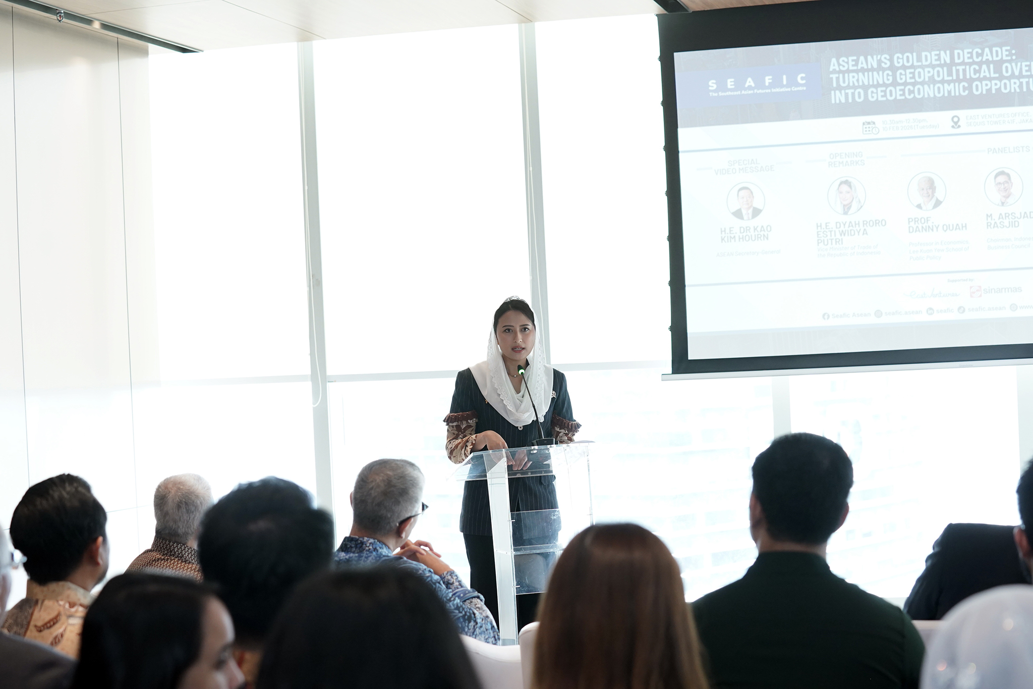 Wakil Menteri Perdagangan RI, memberikan opening remarks pada acara Soft Launch dan Inaugural Policy Dialogue Southeast Asia Futures Initiative Centre (SEAFIC) yang berlangsung di Jakarta, Selasa (10 Feb). Acara ini mengusung tema mengusung tema “ASEAN’s Golden Decade: Turning Geopolitical Overload into Geoeconomic Opportunity.”