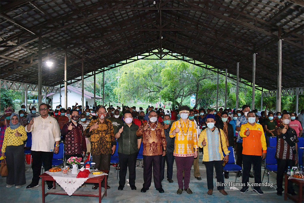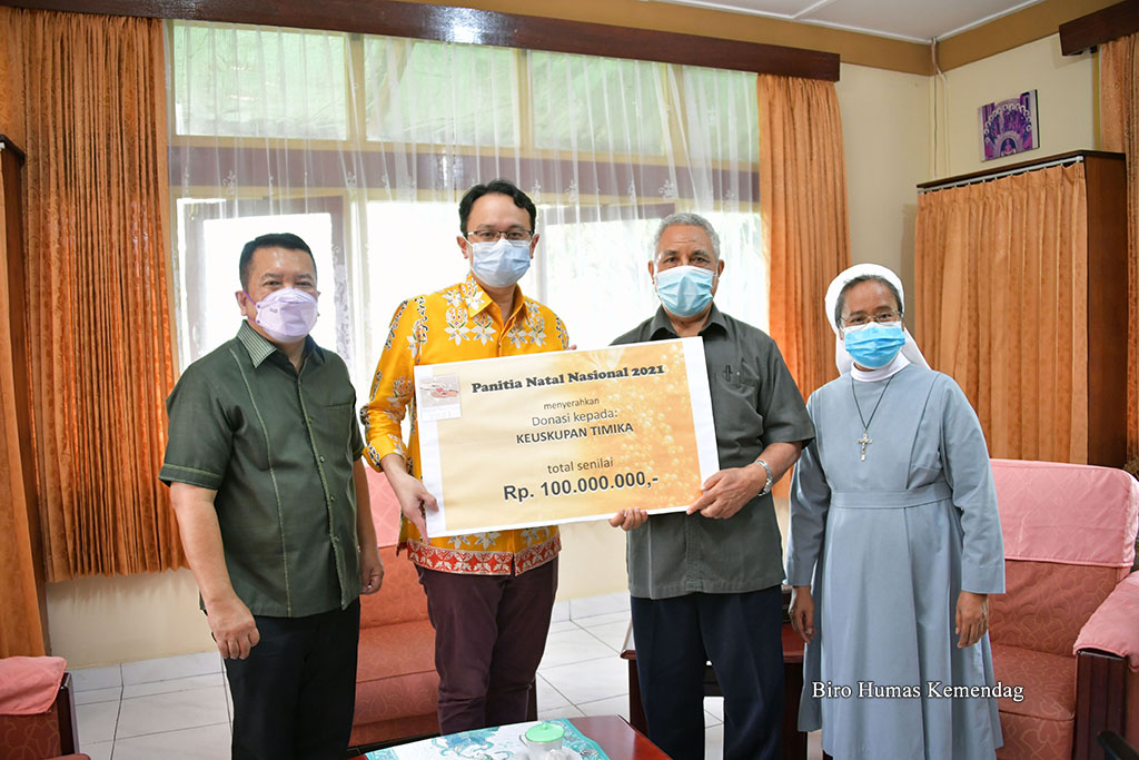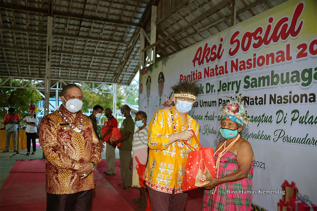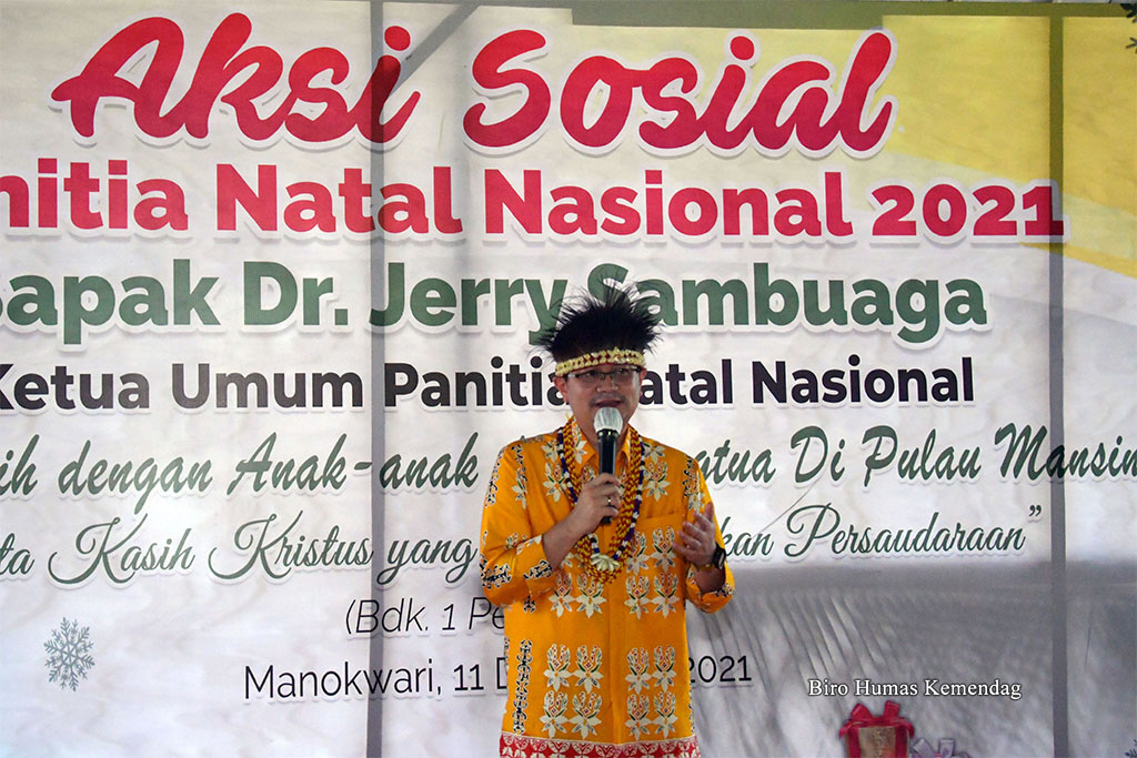 Wakil Menteri Perdagangan, Jerry Sambuaga selaku Ketua Perayaan Natal Nasional menyerahkan bantuan berupa bingkisan 500 paket sembako kepada masyarakat di Pulau Mansinam Manokwari, Papua Barat, Jumat (10 Des). Acara penyerahan bantuan ini dihadiri Bupati Manokwari, Hermus Indou; Wakil Ketua DPRD Manokwari, Norman Tambunan; pejabat Pemkab Manokwari; serta masyarakat setempat.