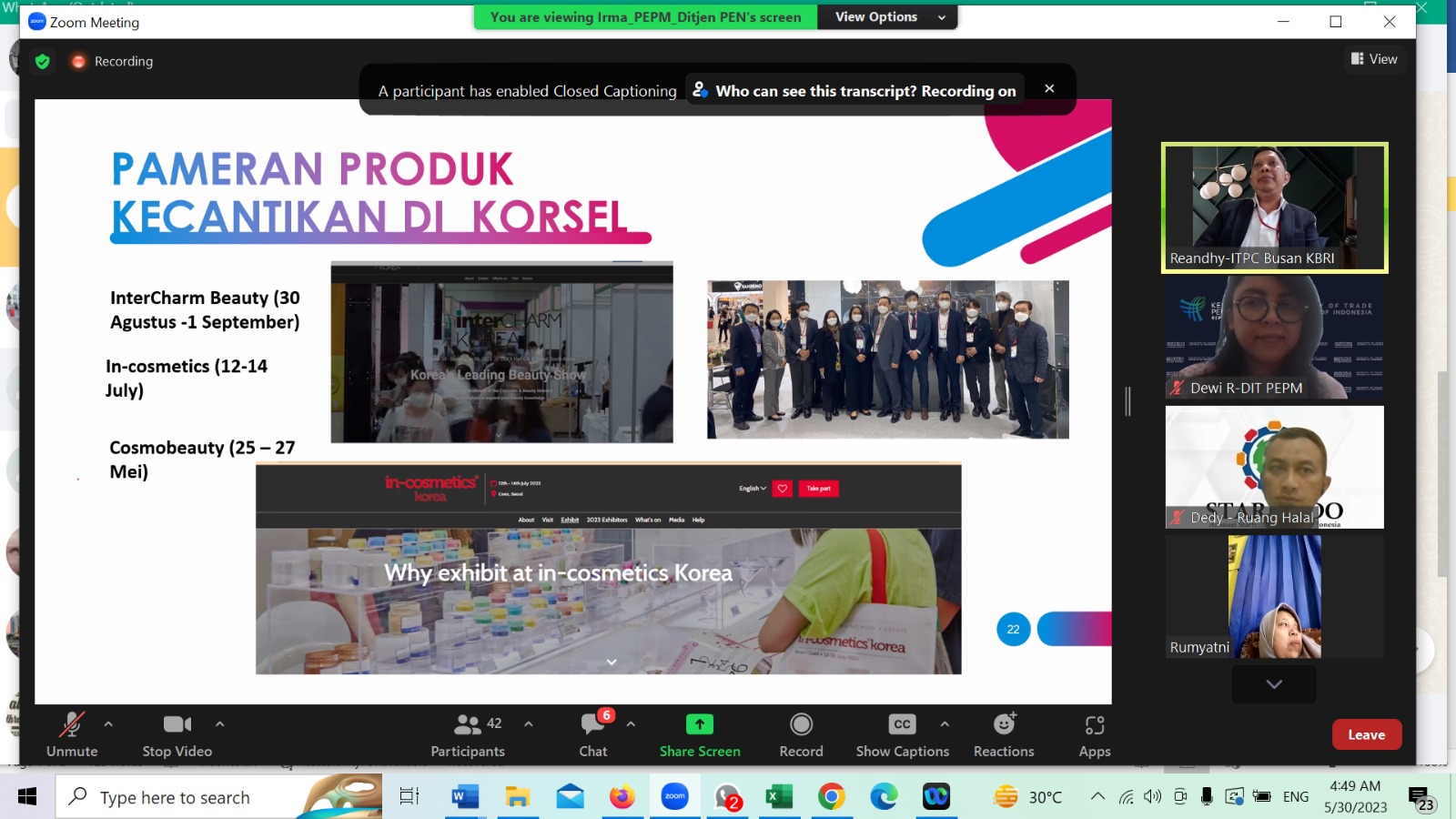 Pada kesempatan ini, Kepala ITPC Busan menyampaikan bahwa untuk bisa menembus pasar ekspor ke Korea Selatan, pelaku usaha perlu memperhatikan beberapa ketentuan The Korean Ministry of Food and Drug Safety (MFDS) serta berpartsipasi pada ajang pameran kosmetik yang digelar di Korea Selatan.